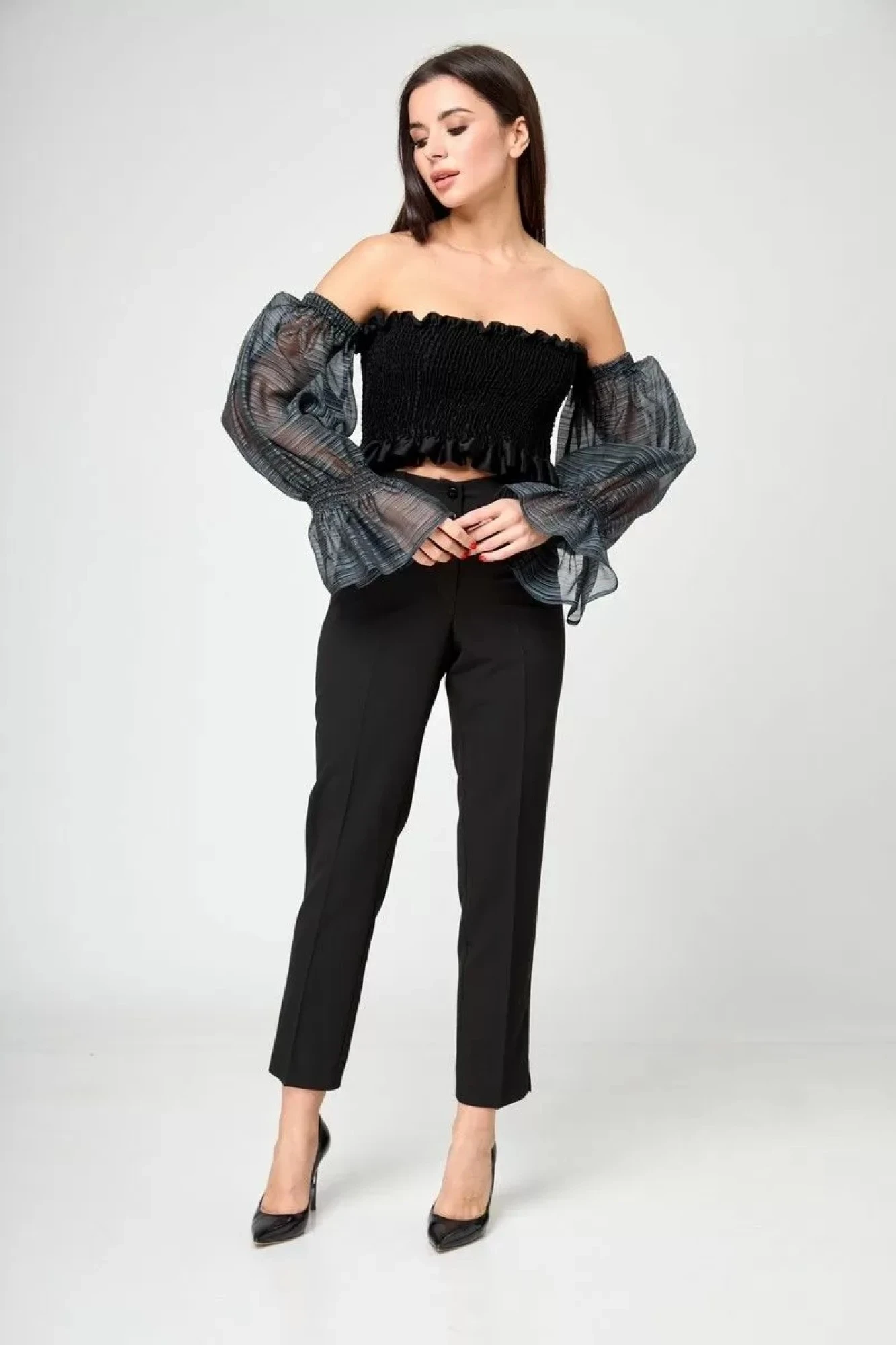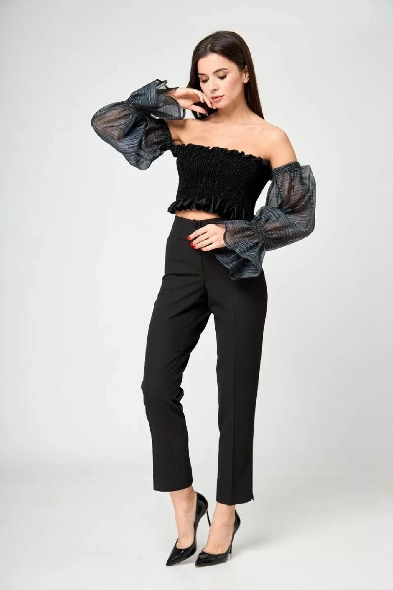 Применяйте топ с брюками , юбками и джинсами .