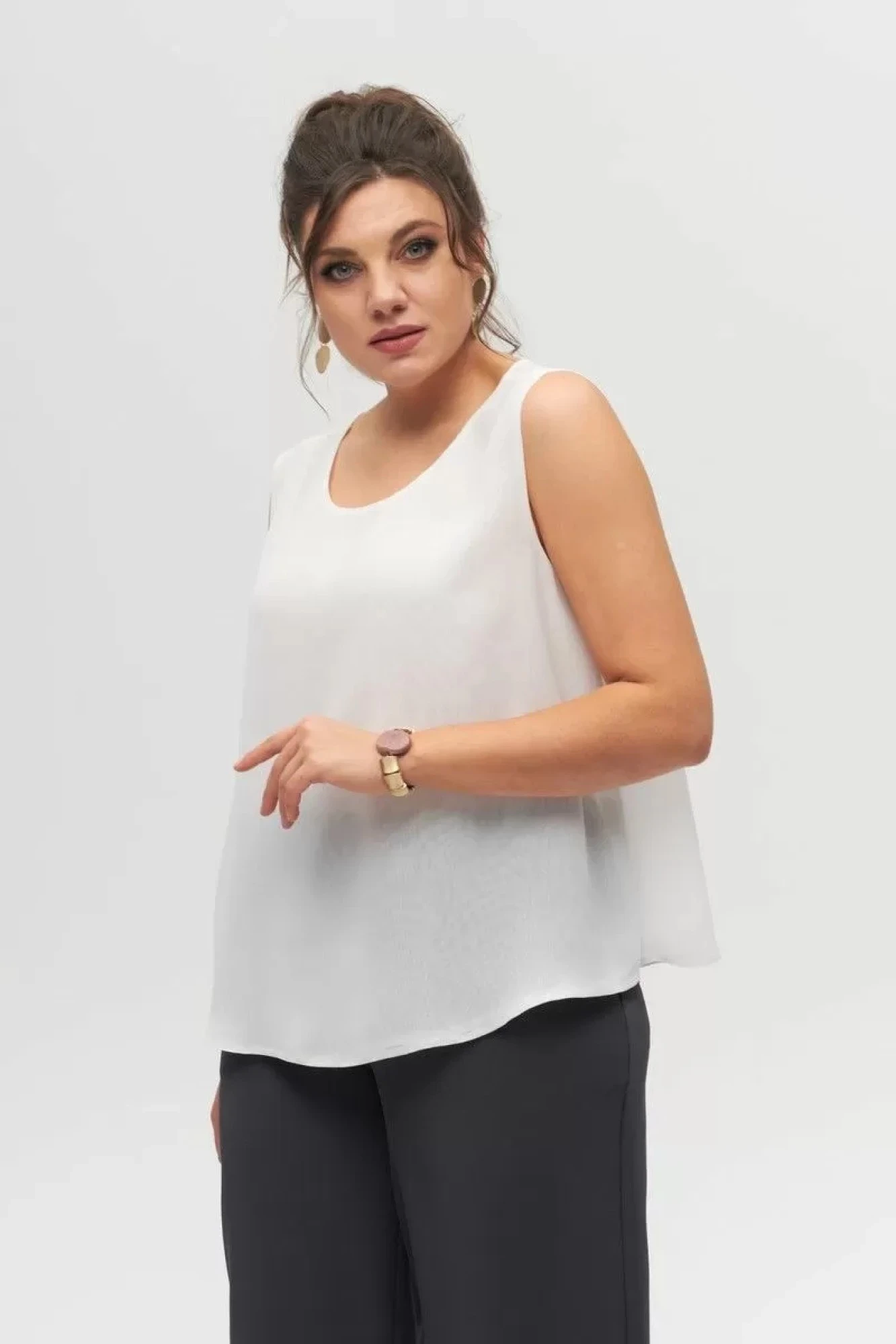 52,54,56Топ свободного силуэта, немного расширенного к низу, перед двойной, не просвечивает, по спинке выполнен разрез-щель с застёжкой на навесную петлю и красивую пуговицу.