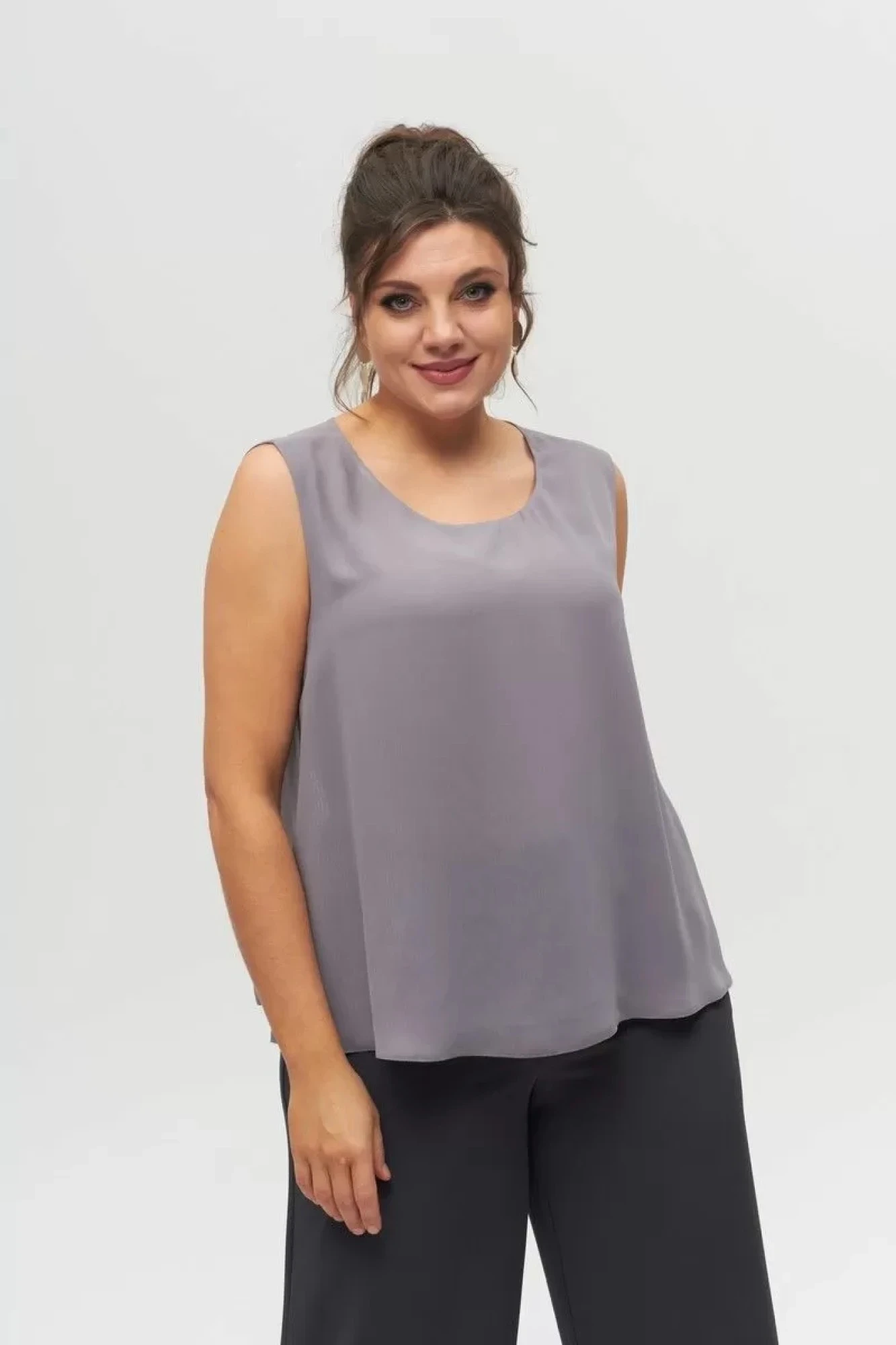 Топ свободного силуэта, немного расширенного к низу, перед двойной, не просвечивает, по спинке выполнен разрез-щель с застёжкой на навесную петлю и красивую пуговицу.