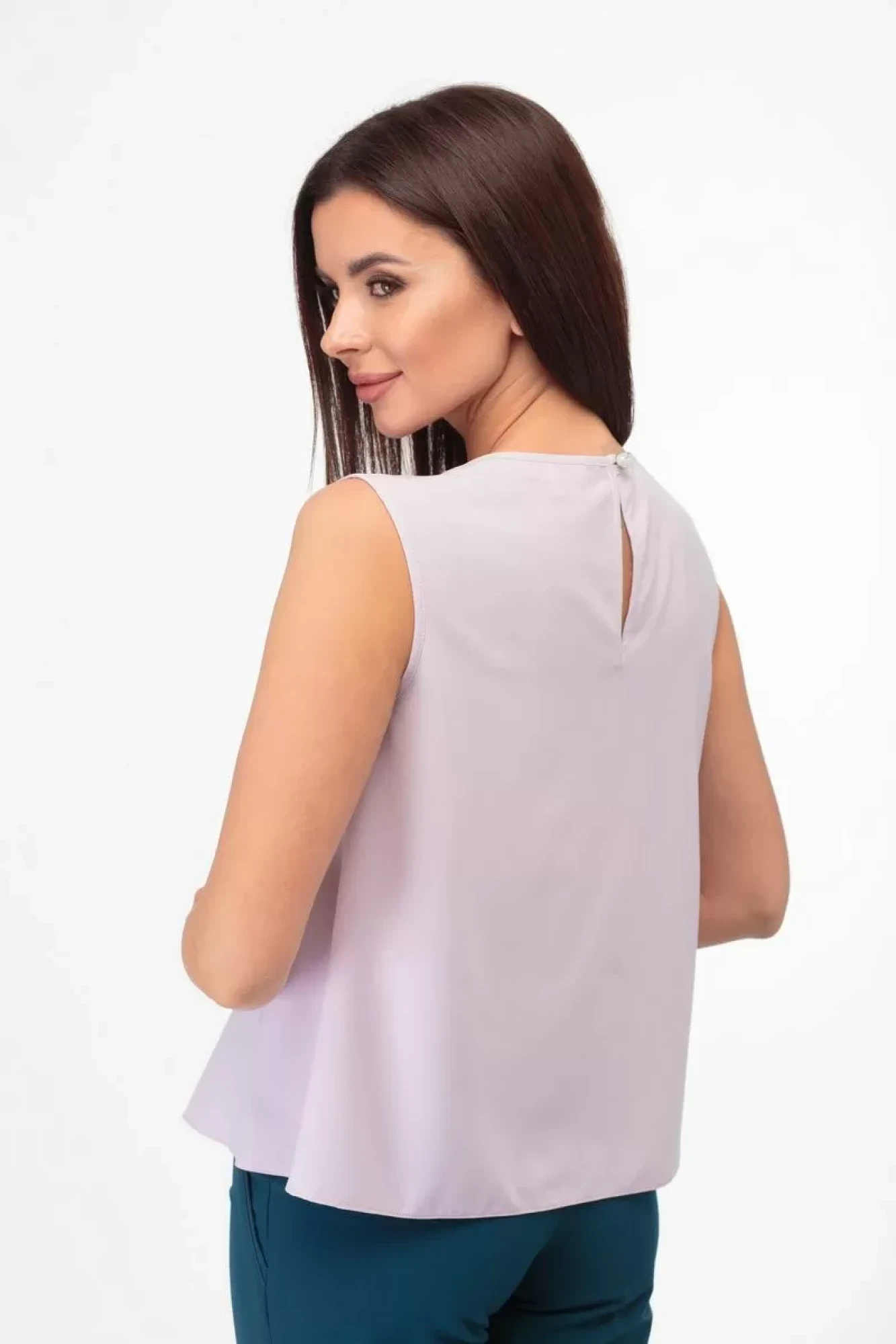 52,54Топ свободного силуэта, немного расширенного к низу, перед двойной, не просвечивает, по спинке выполнен разрез-щель с застёжкой на навесную петлю и красивую пуговицу.