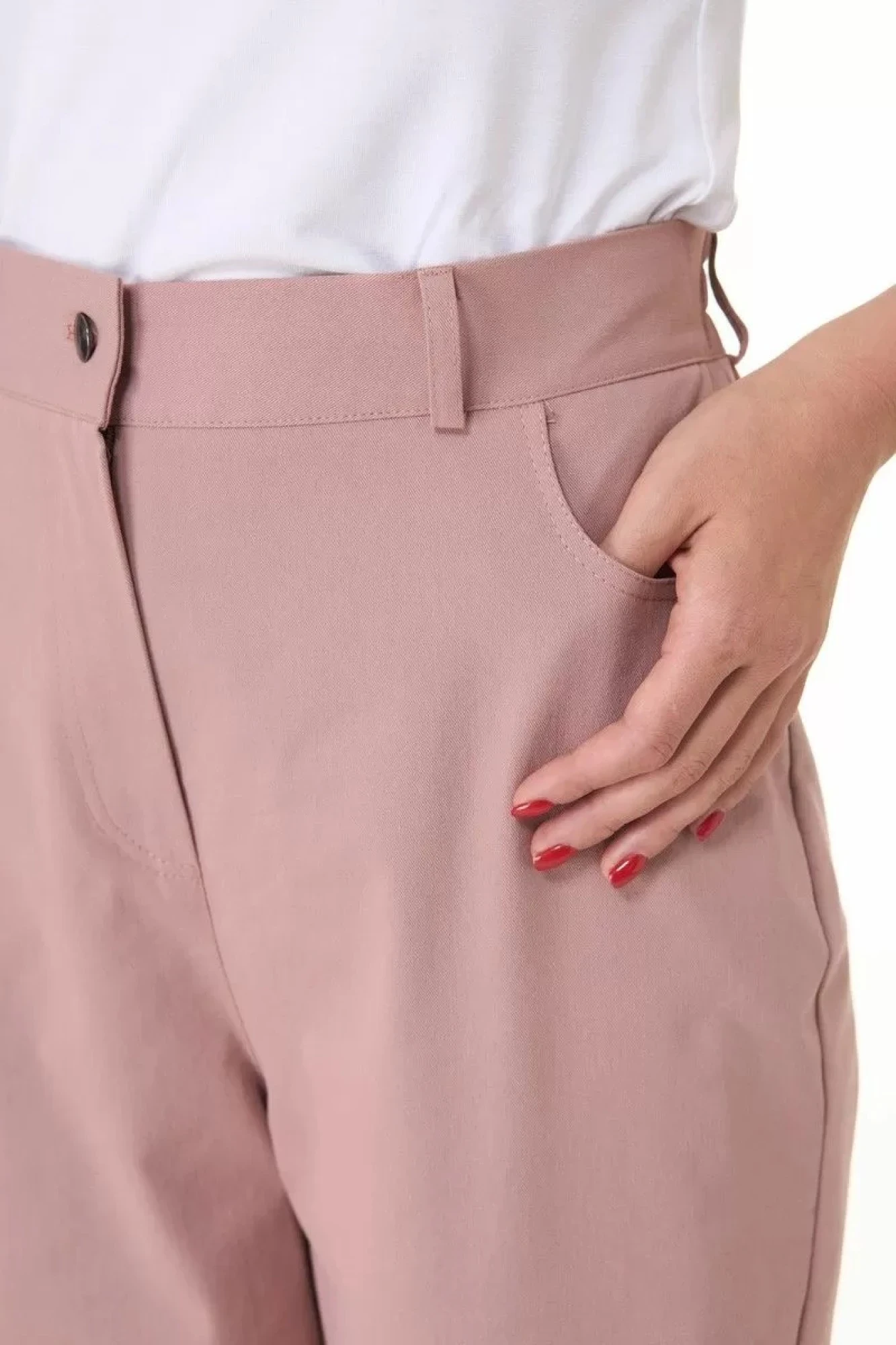 Зауженные книзу за счёт вытачек по передним и задним частям. На передних частях брюк обработаны карманы с отрезным бочком.