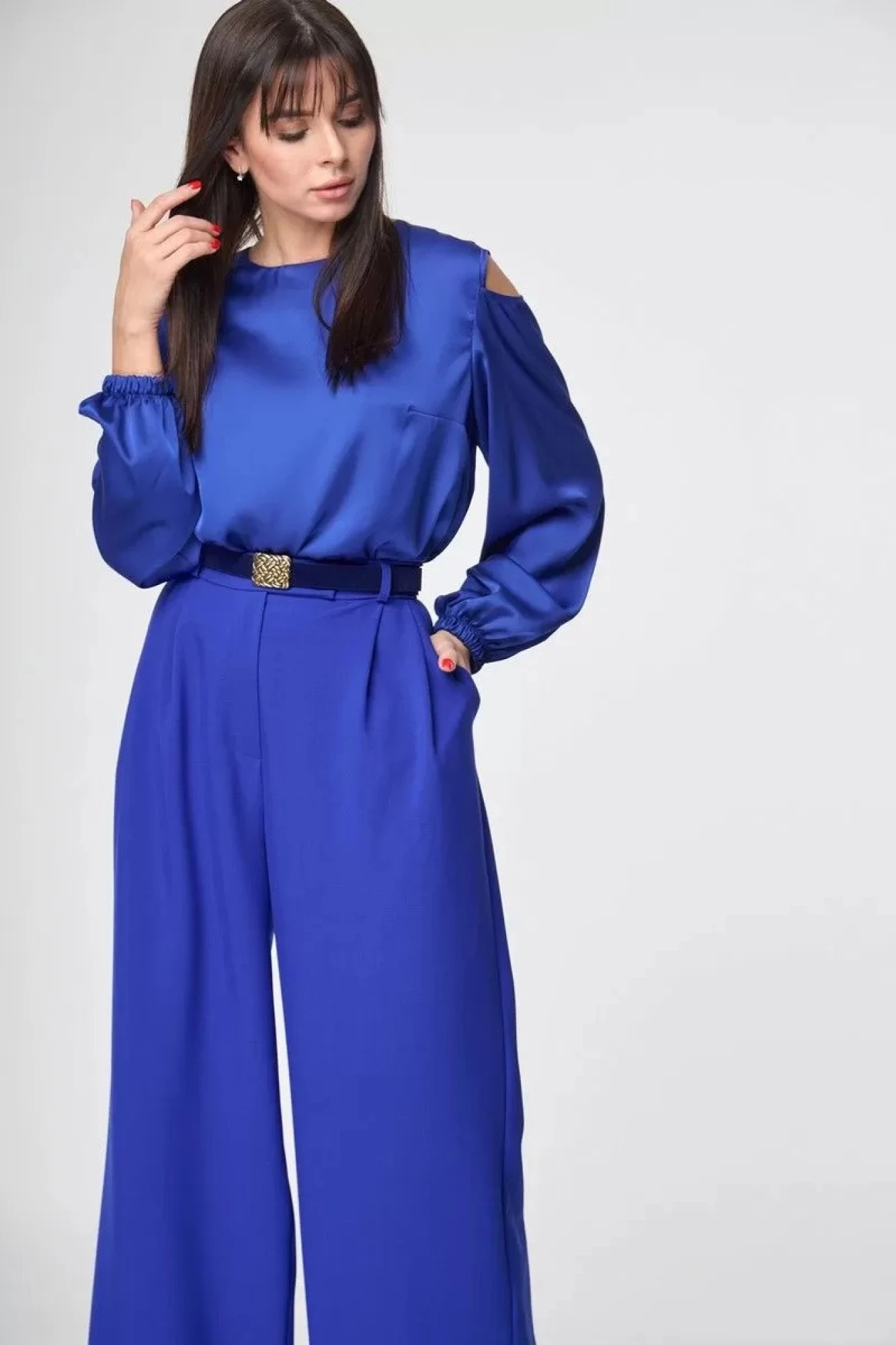 Притачной пояс, боковые функциональные карманы, мягкие складки по переду.