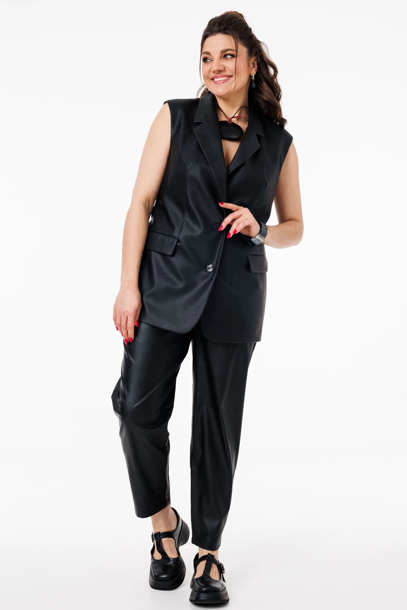 На модели в брюках цвета «пантера» жилет из эко кожи 1502.1 и рубашка 1393.