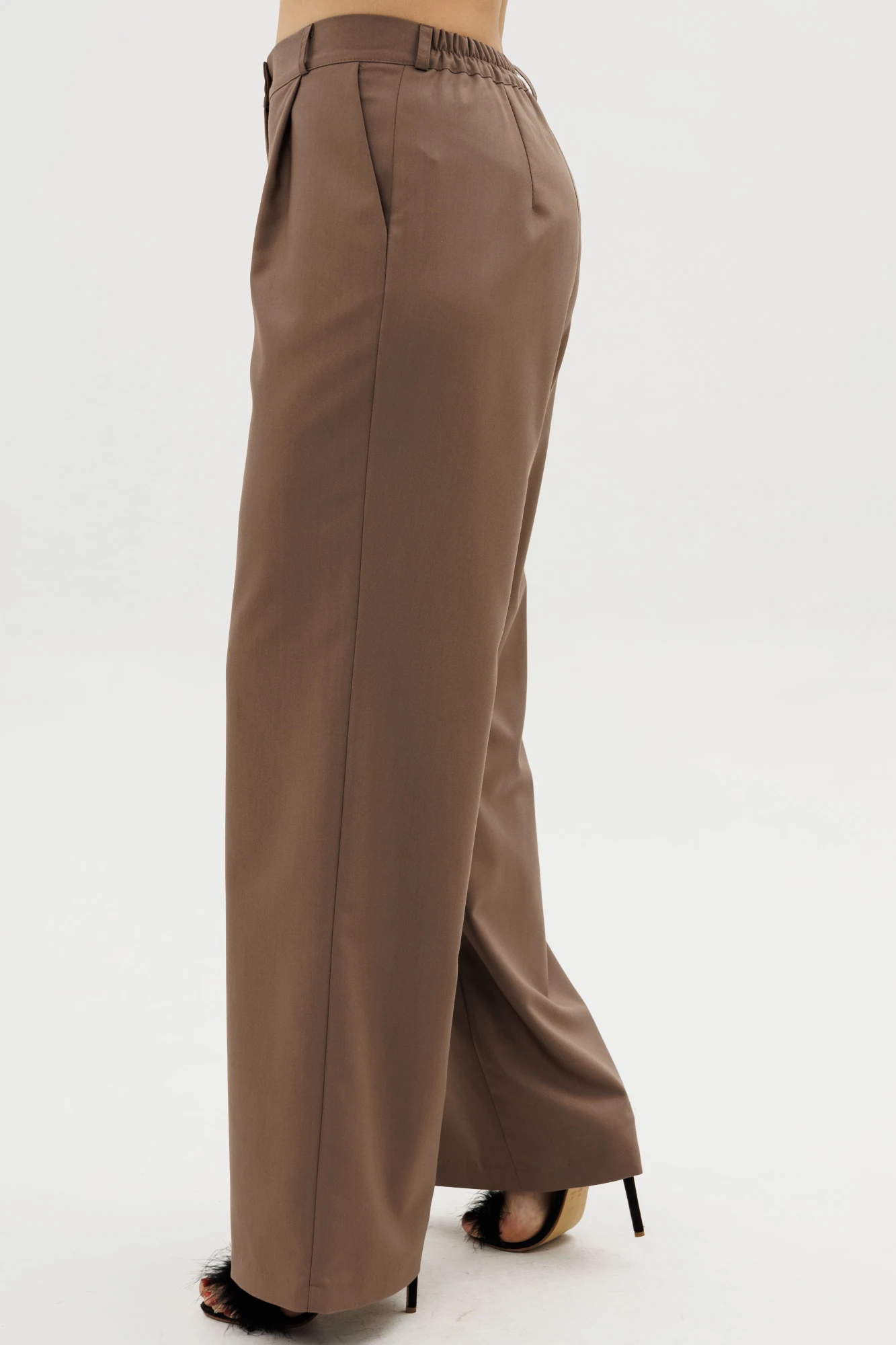 Идеальная посадка достигнута за счет эластичной резинки по спинке, которая мягко облегает фигуру, подчеркивая линию талии и обеспечивая комфорт в течение всего дня. Широкие штанины визуально удлиняют ноги, добавляя образу женственности и грации.