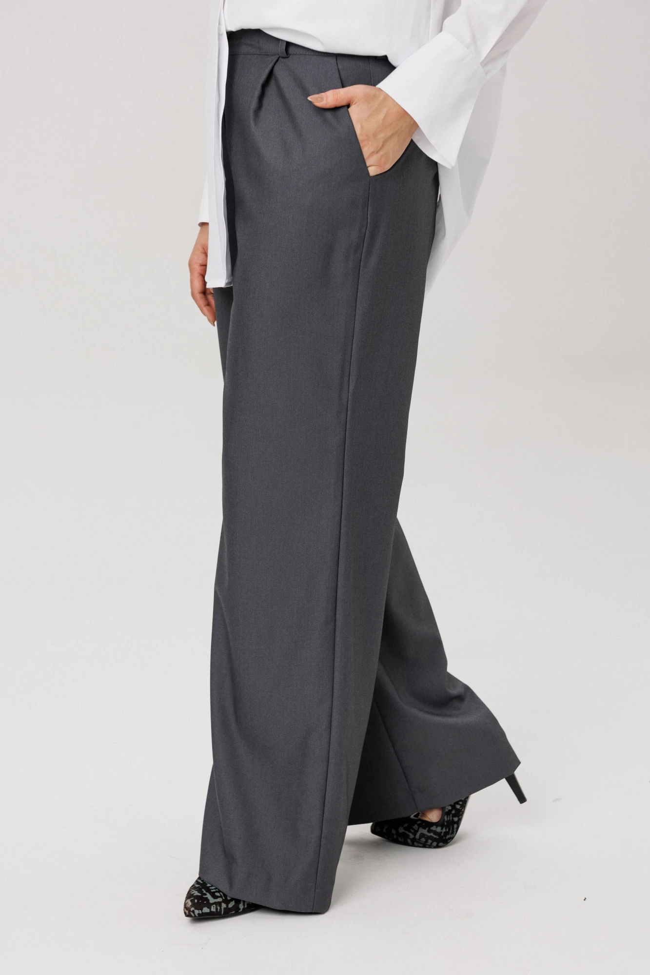 62,64Широкие, струящиеся силуэты, мягко ниспадающие от талии, создают эффект роскошного движения с каждым шагом, серый цвет – официальность и в тоже время легкость.