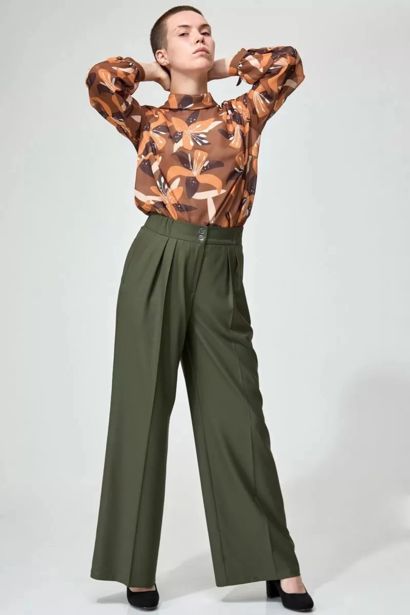46,48,50,52,54,56Брюки широкие длинные, с заутюженными стрелками, с высокой посадкой. На передних половинках складки. Пояс притачной с застежкой на молнию, петли и пуговицы, со вставками эластичной тесьмы по бокам. В боковых швах расположены карманы с косым входом.