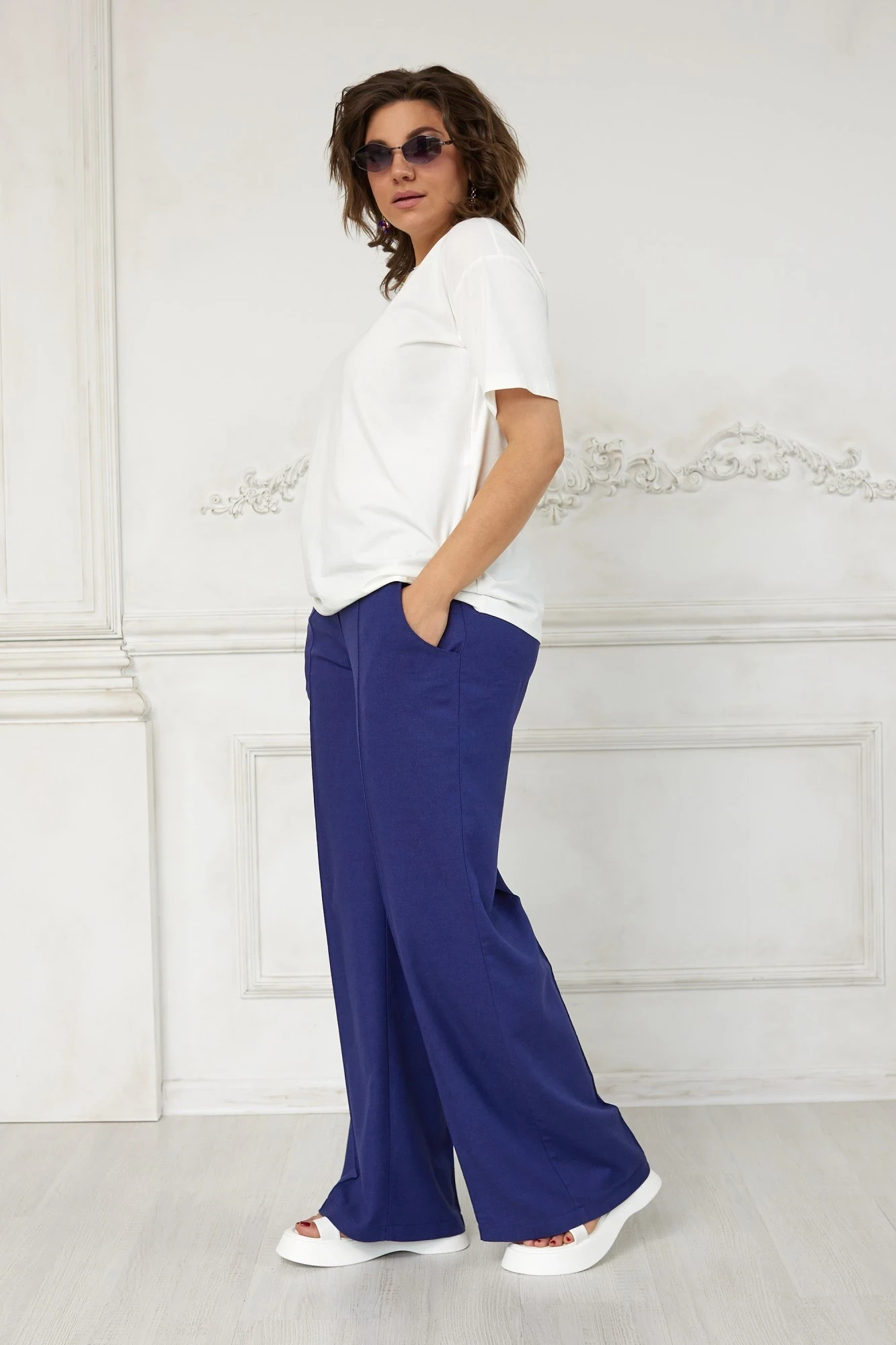 Брюки свободного кроя, комфортной носки. Главная особенность в том, что они делают любые ноги визуально длиннее за счёт застроченных стрелок по передней части. Пояс притачной, без застёжки, частично с эластичной резинкой. В боковых швах имеются карманы с отрезным бочком.