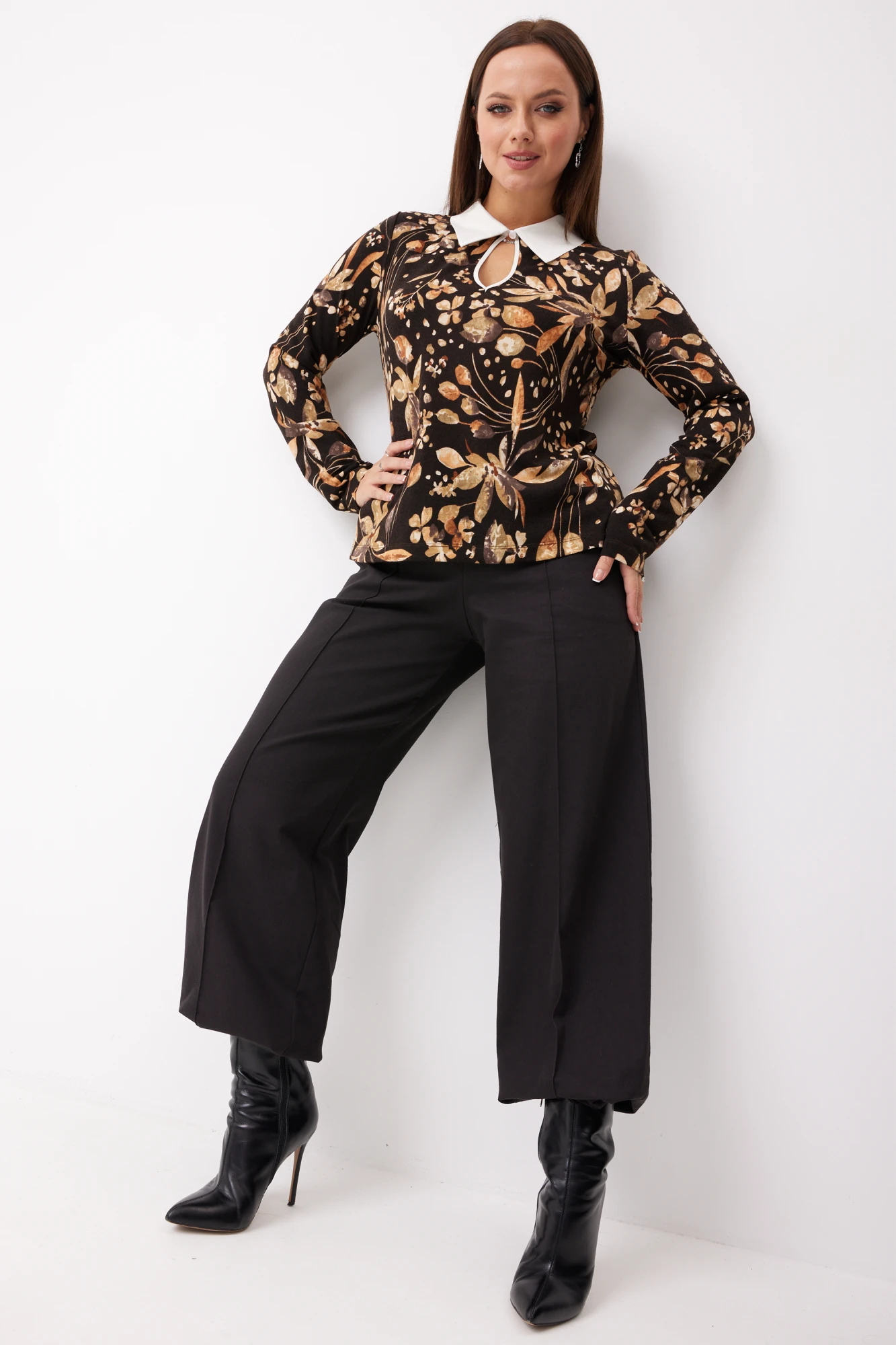 Низ брюк обработан эластичной манжетой, что позволяет создать эффект нависания по низу.