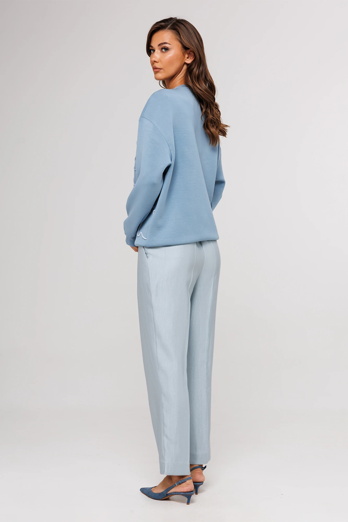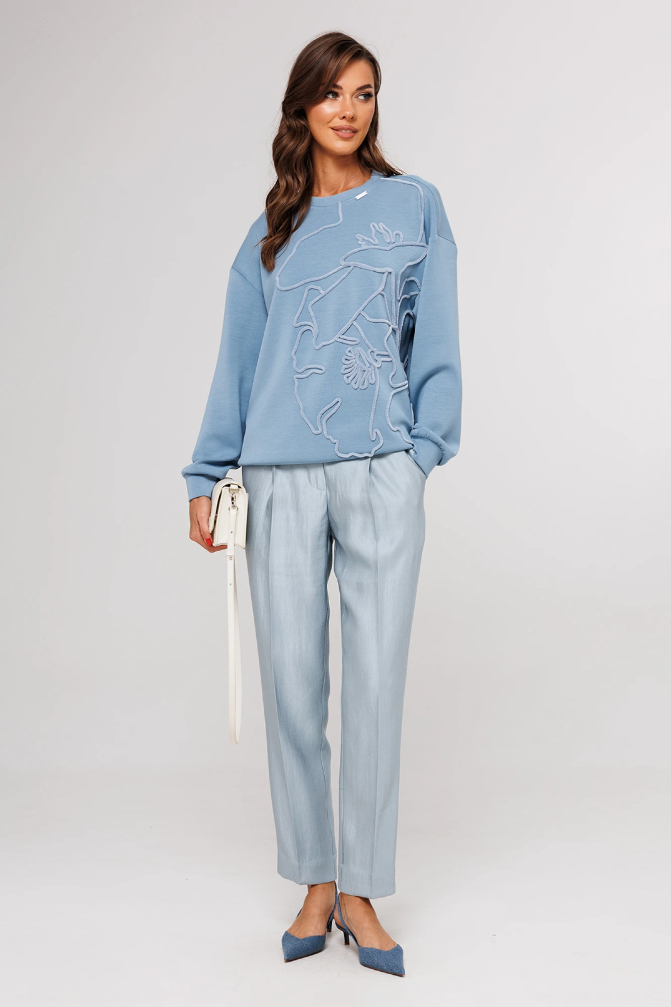 Брюки, зауженные к низу на притачном поясе со шлевками и застежкой-гульфик. Пояс застегивается на петлю-пуговицу и потайную петлю-пуговицу. По переду со складкой и карманами в боковых швах с наклонным входом. По переду и спинке заутюжены вертикальные стрелки по всей длине брюк. По спинке пояс на резинке. Внизу по боковым швам обработаны небольшие разрезы.