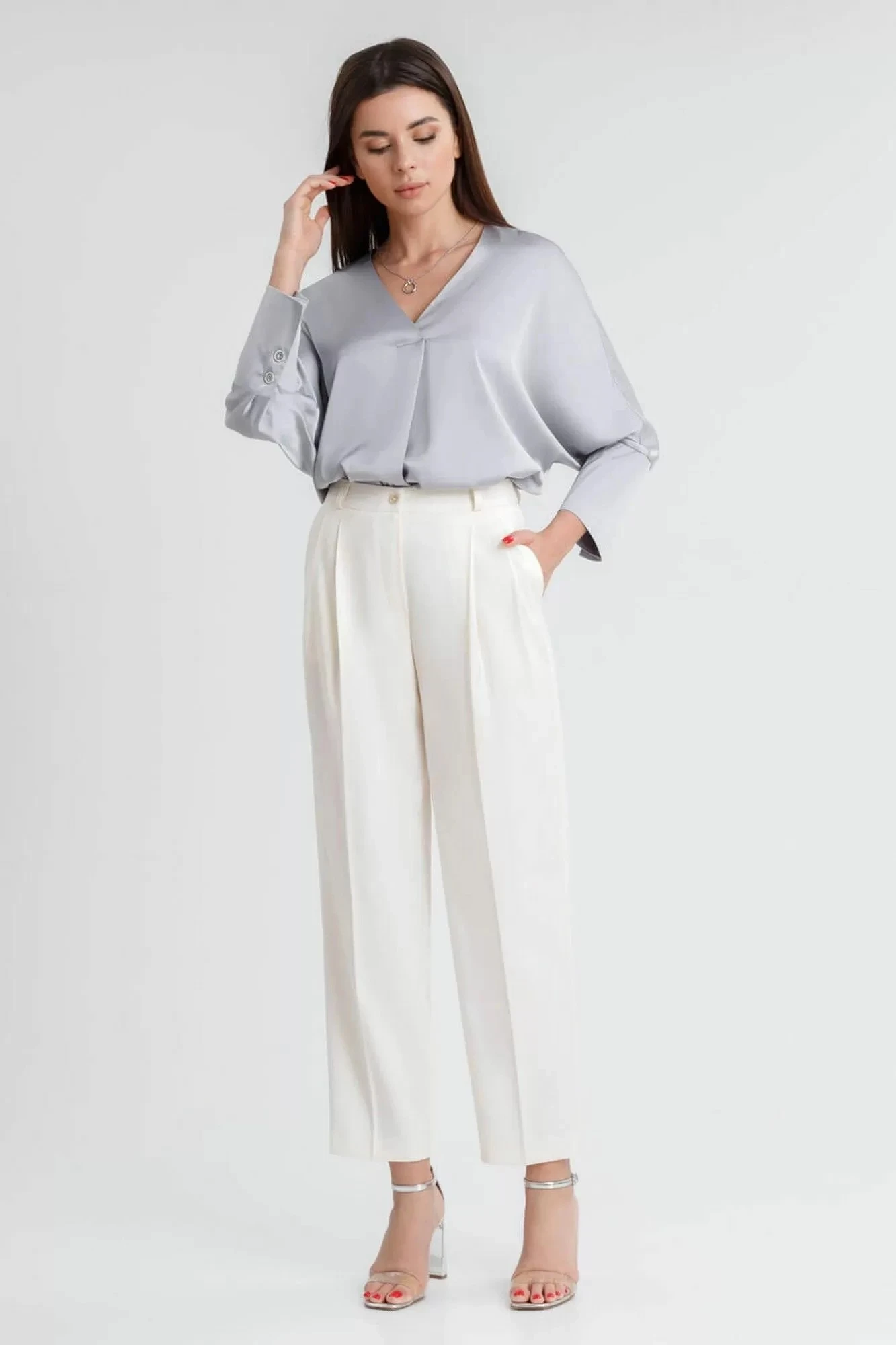 Высокая посадка на талии, притачной пояс со шлевками. Застежка на молнию и пуговицу.