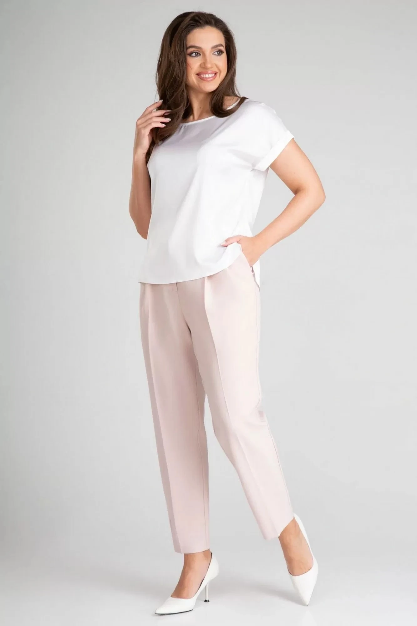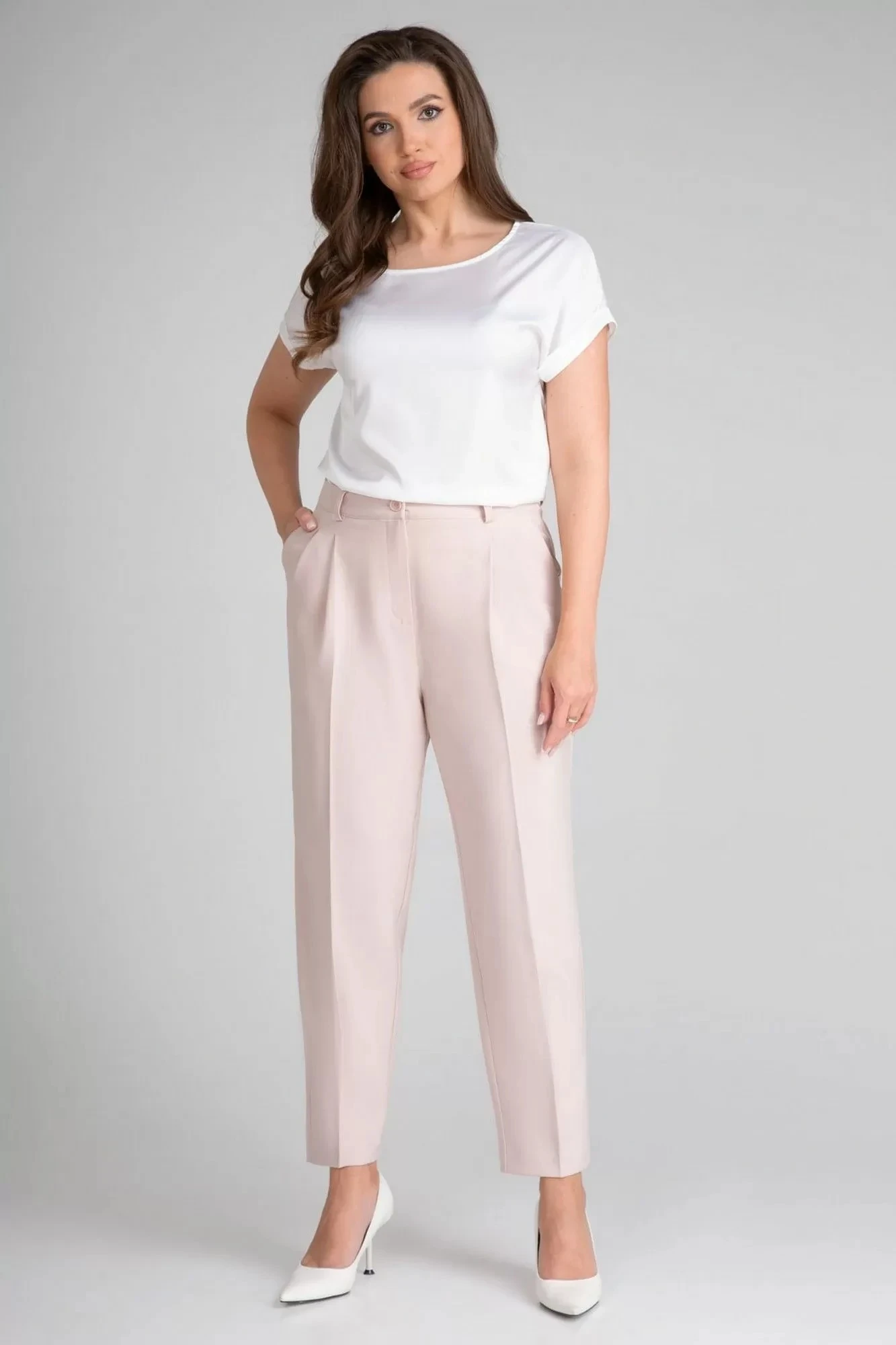 Высокая посадка на талии, притачной пояс со шлевками. Застежка на молнию и пуговицу.
