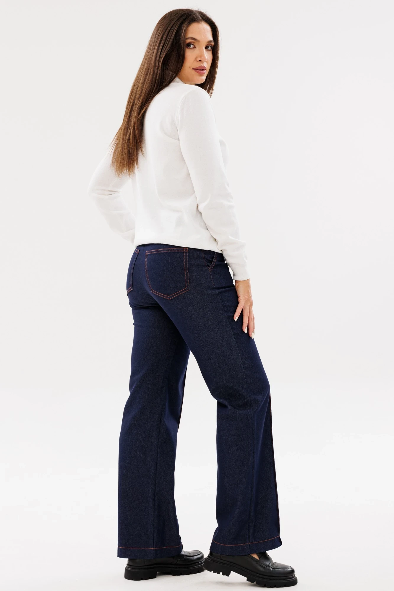 На передней половинке функциональные карманы с диагональным входом. На брюках заутюжены стрелки, по которым проходит декоративная отделочная строчка. Застежка спереди на молнию с гульфиком и петлю-пуговицу. На задних половинках накладные карманы. Брюки декорированы отделочной строчкой контрастного цвета.