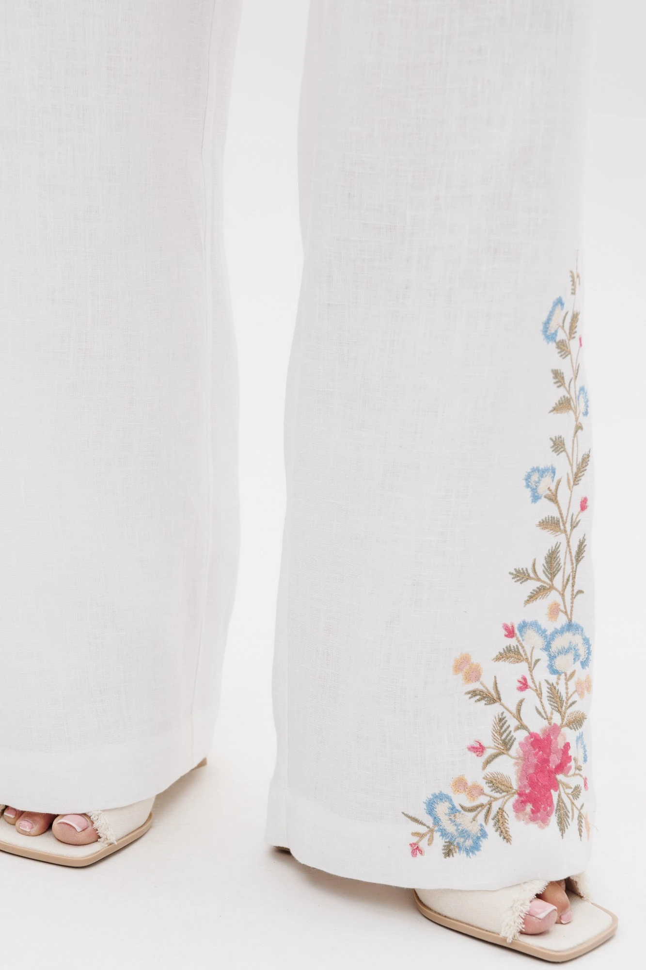 Пояс притачной на резинке. Передняя половинка брюк с дизайнерской вышивкой и функциональными карманами с диагональным входом.