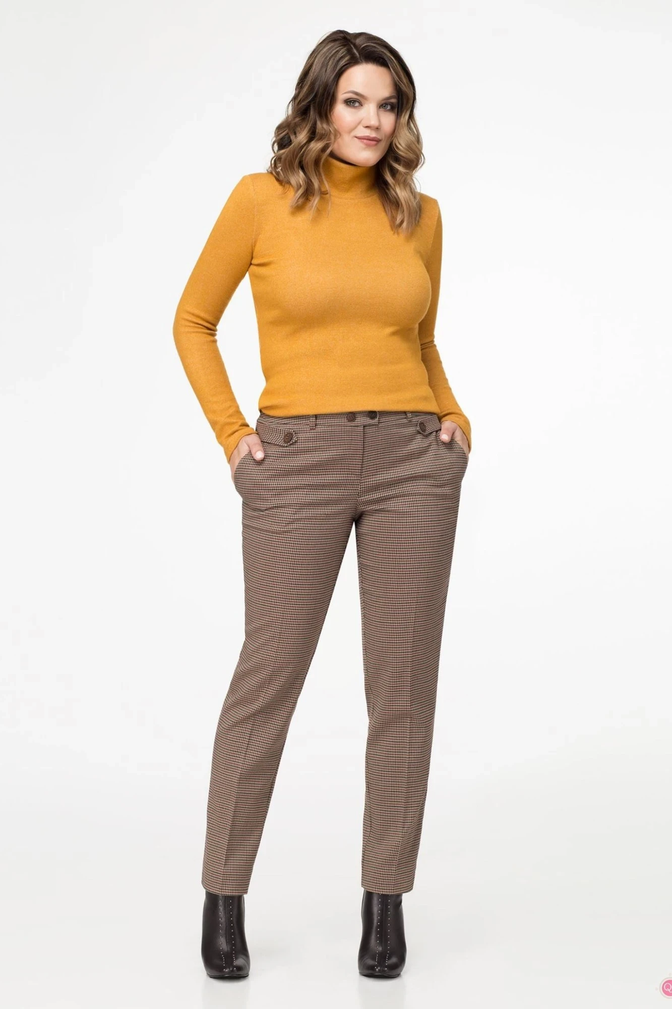 Стильный вискозные брюки, рисунок в мелкую клетку. Брюки прямые на поясе, на две петли пуговицы, по переду два кармана от боковых швов с декоративными патами на сквозную пуговицу, сзади вытачки от пояса, один карман, вход оформлен листочкой. Брюки удачно сочетаются со спортивной обувью, так и с туфлями на каблуке.
