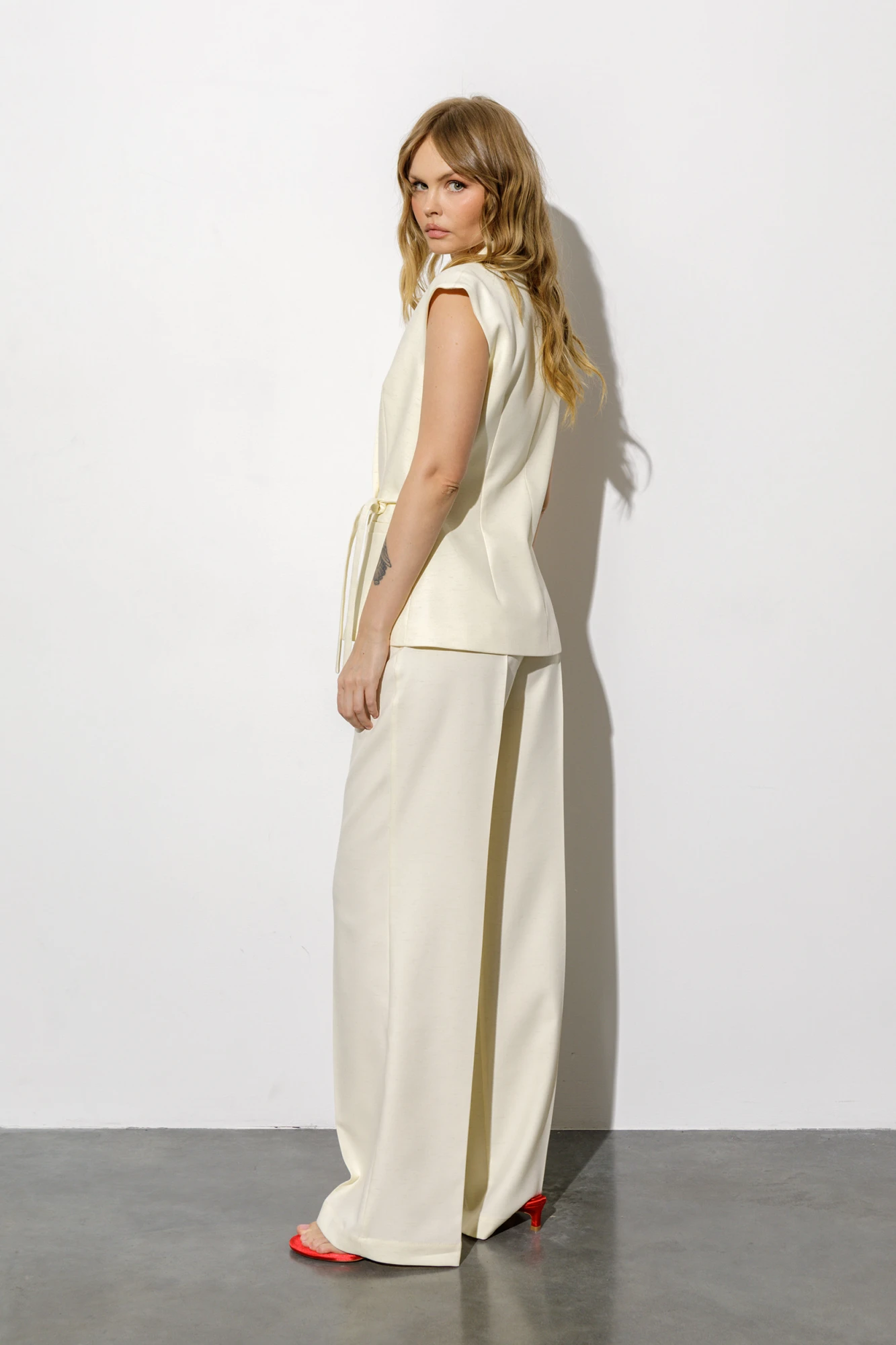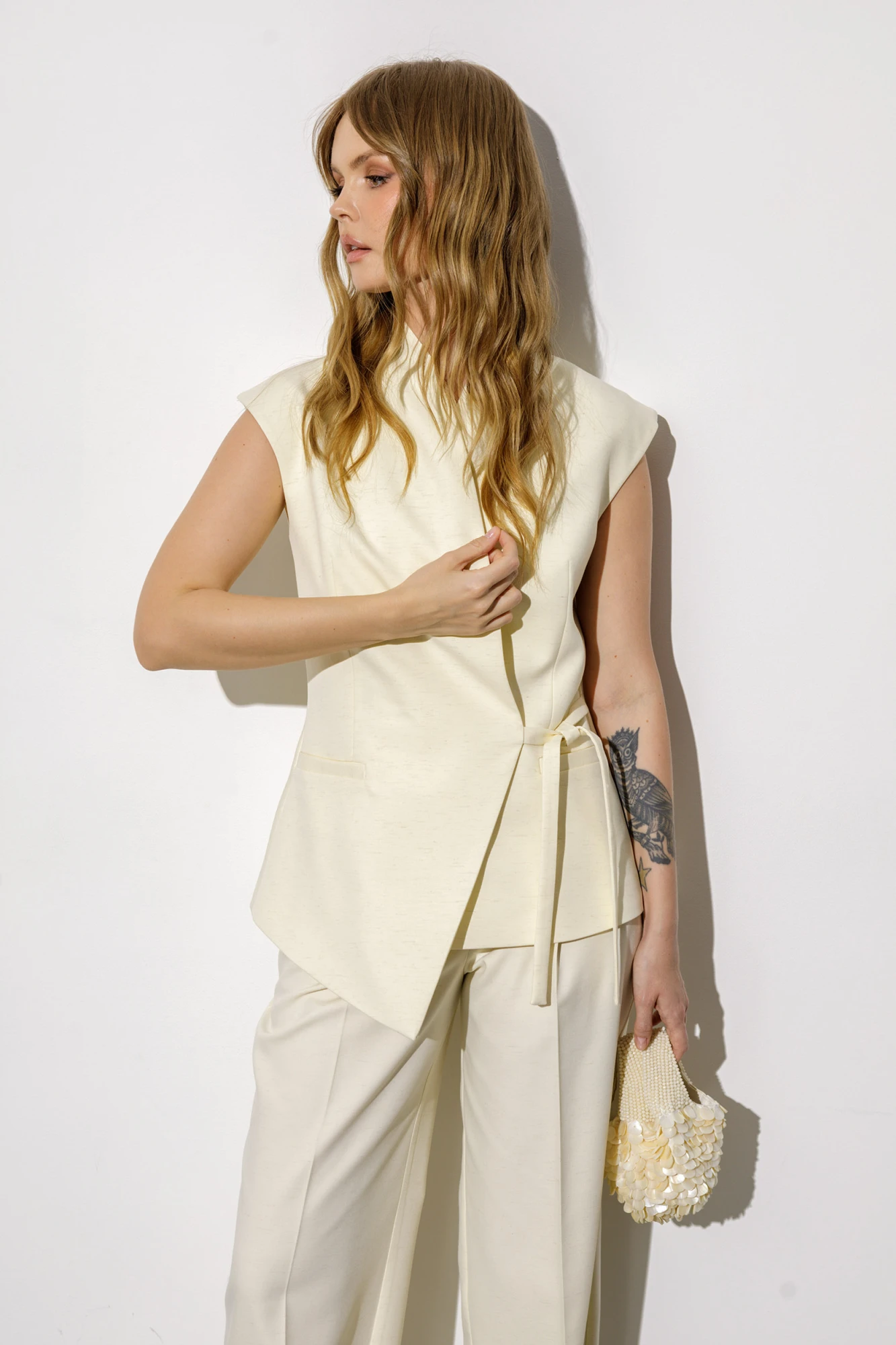 Детали: Брюки с притачным поясом со шлевками, передние половины с небольшими застроченными мягкими складками и заутюженными стрелками, застежка на молнию и пуговицу, боковые карманы.