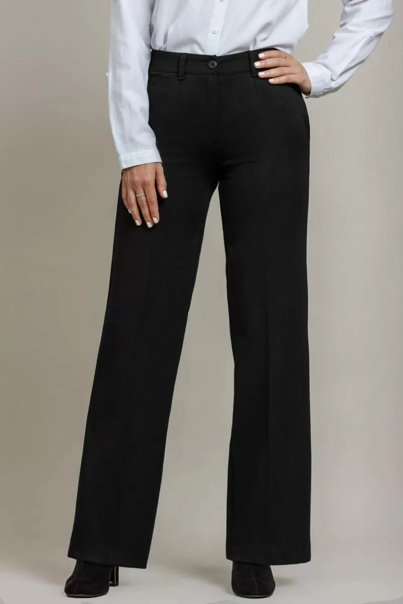 К низу широкий клёш. Посадка высокая.