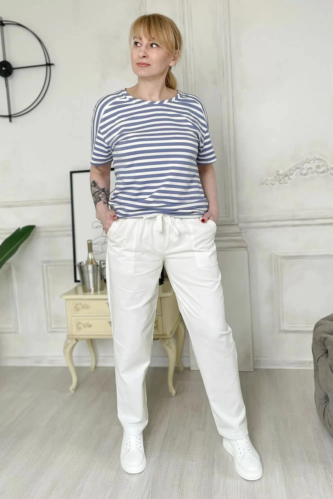 Обхват бедер: 114 см. Ширина по низу брюк: 20,5 см. Обхват по ягодицей: 70 см.