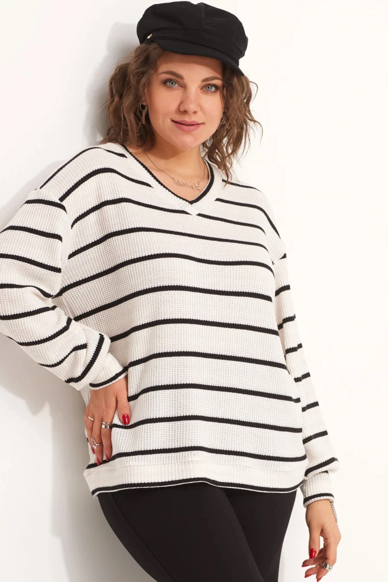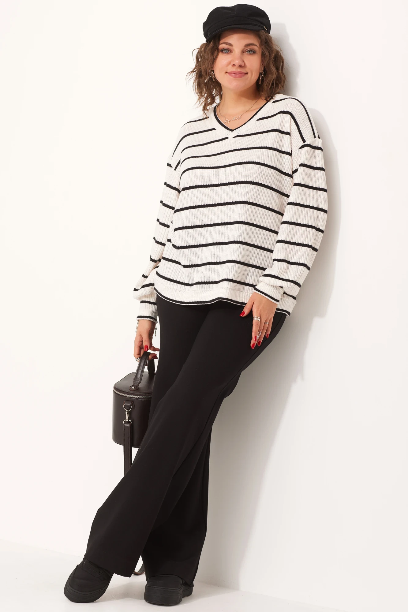 Свитшот свободного силуэта, с V-образным вырезом, обработанным обтачкой, пройма рукава спущена, низ рукава и низ изделия обработаны манжетой из основного материала. Модель выполнена из тактильно приятного трикотажа с содержанием вискозы.