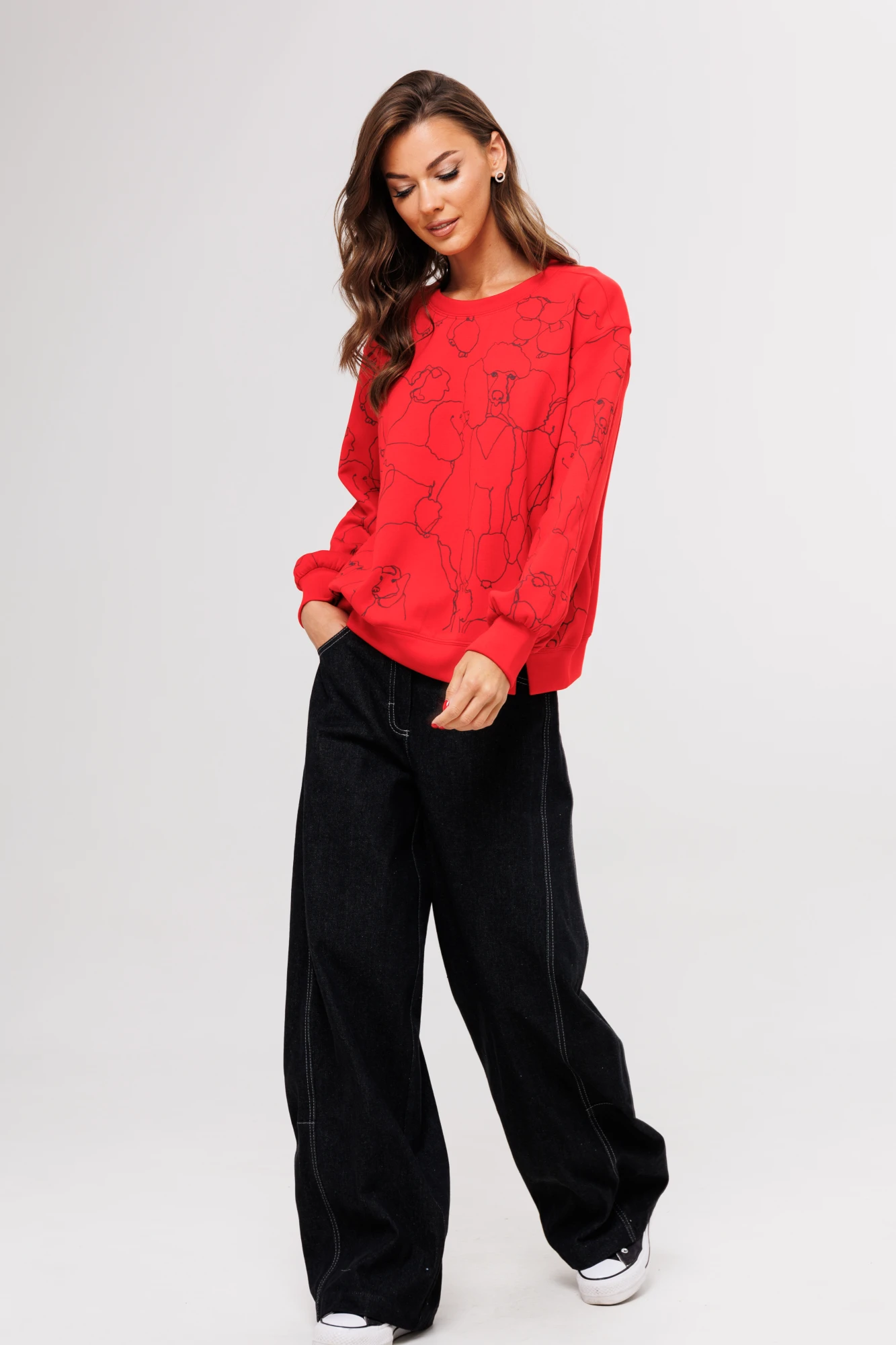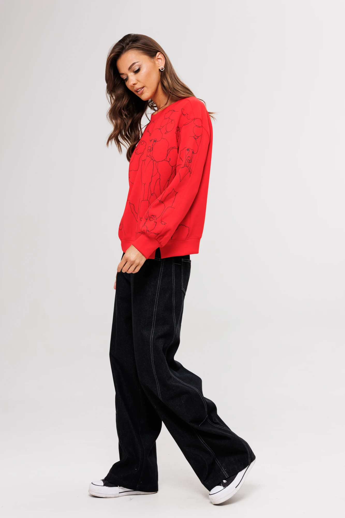 48, 50 , 52Длина джемпера около 67 см. Длина рукава с плечом около 74 см. На фото представлены брюки от костюма 5205."