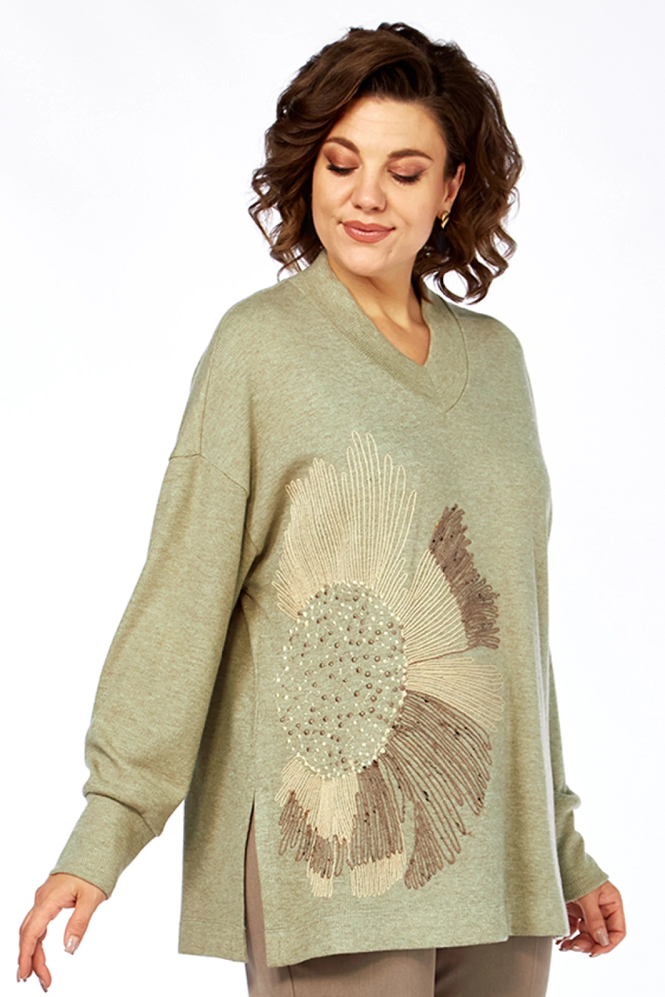 Длина джемпера по спинке — 67 см, длина плеча + рукав — 73 см.