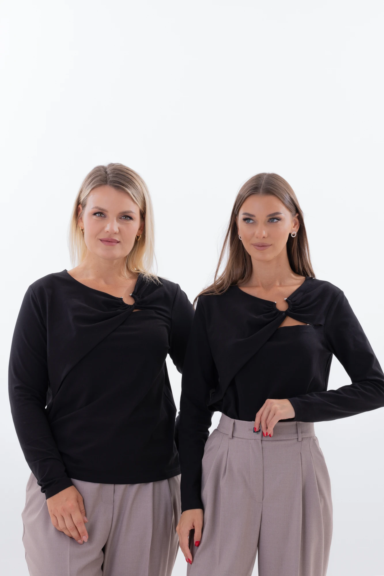 Центральным элементом дизайна становится декоративная кокетка по переду, увенчанная фирменным металлическим кольцом. Эта деталь — не просто украшение, а скульптурный акцент, добавляющий образу архитектурную четкость и современное звучание. Кольцо становится холодным, весомым контрастом нежности мягкого футера.
