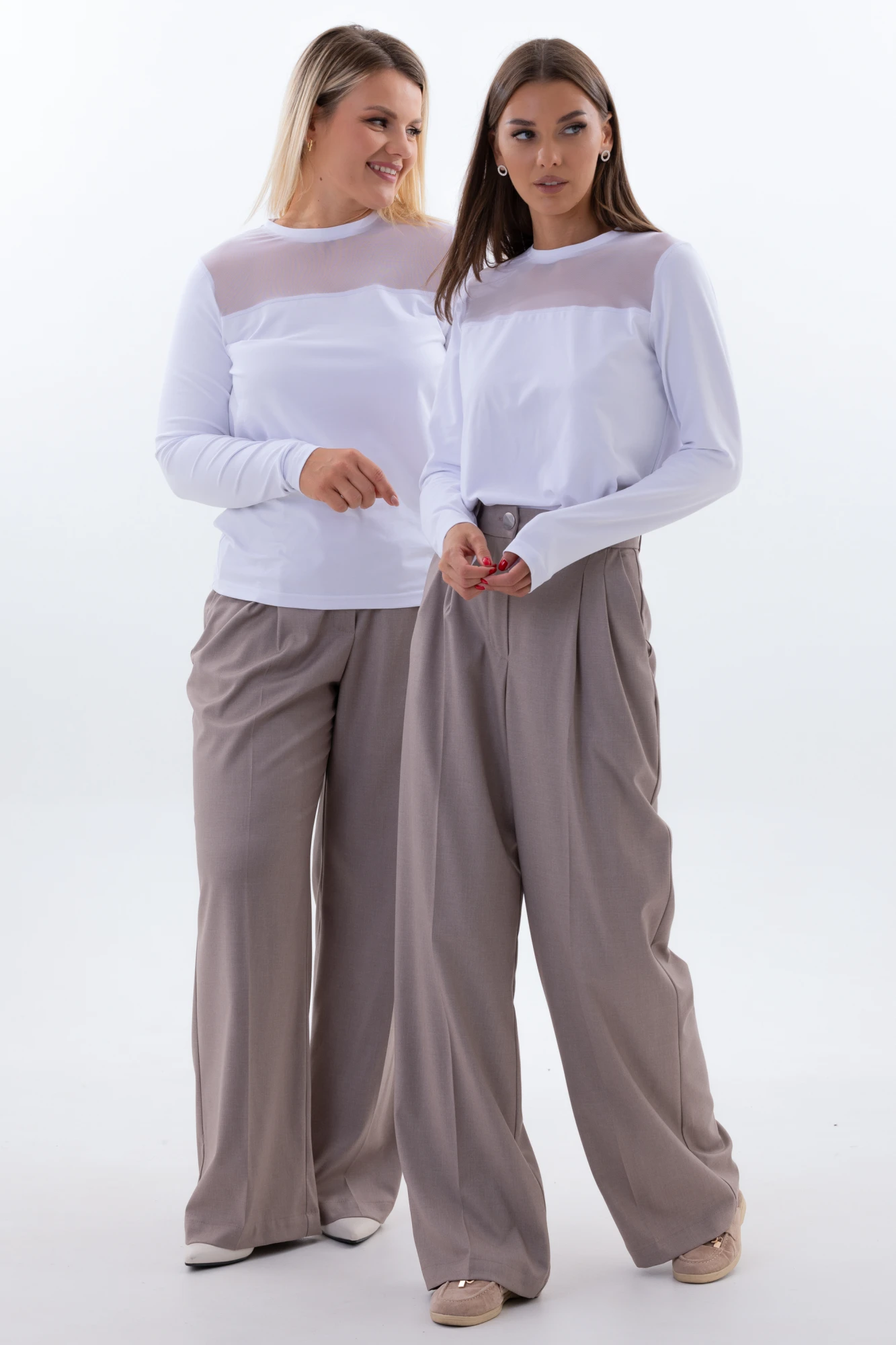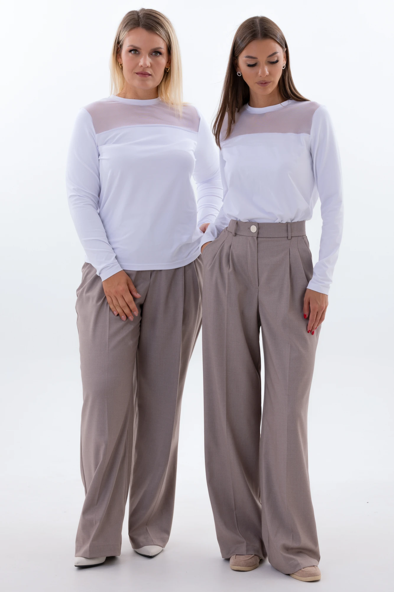 Главная деталь, задающая характер модели, — акцентная кокетка по переду из эластичной сетки в тон основной ткани. Этот дизайнерский прием добавляет образу современное измерение: деликатная прозрачность сетки создает игру фактур и визуальную глубину, оставаясь при этом гармоничной и сдержанной.