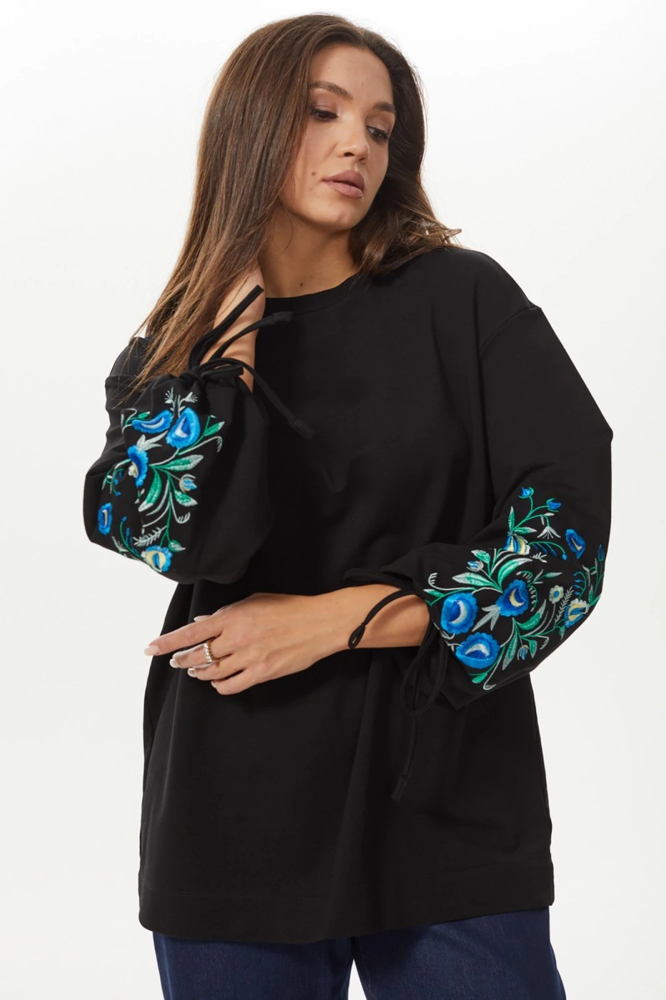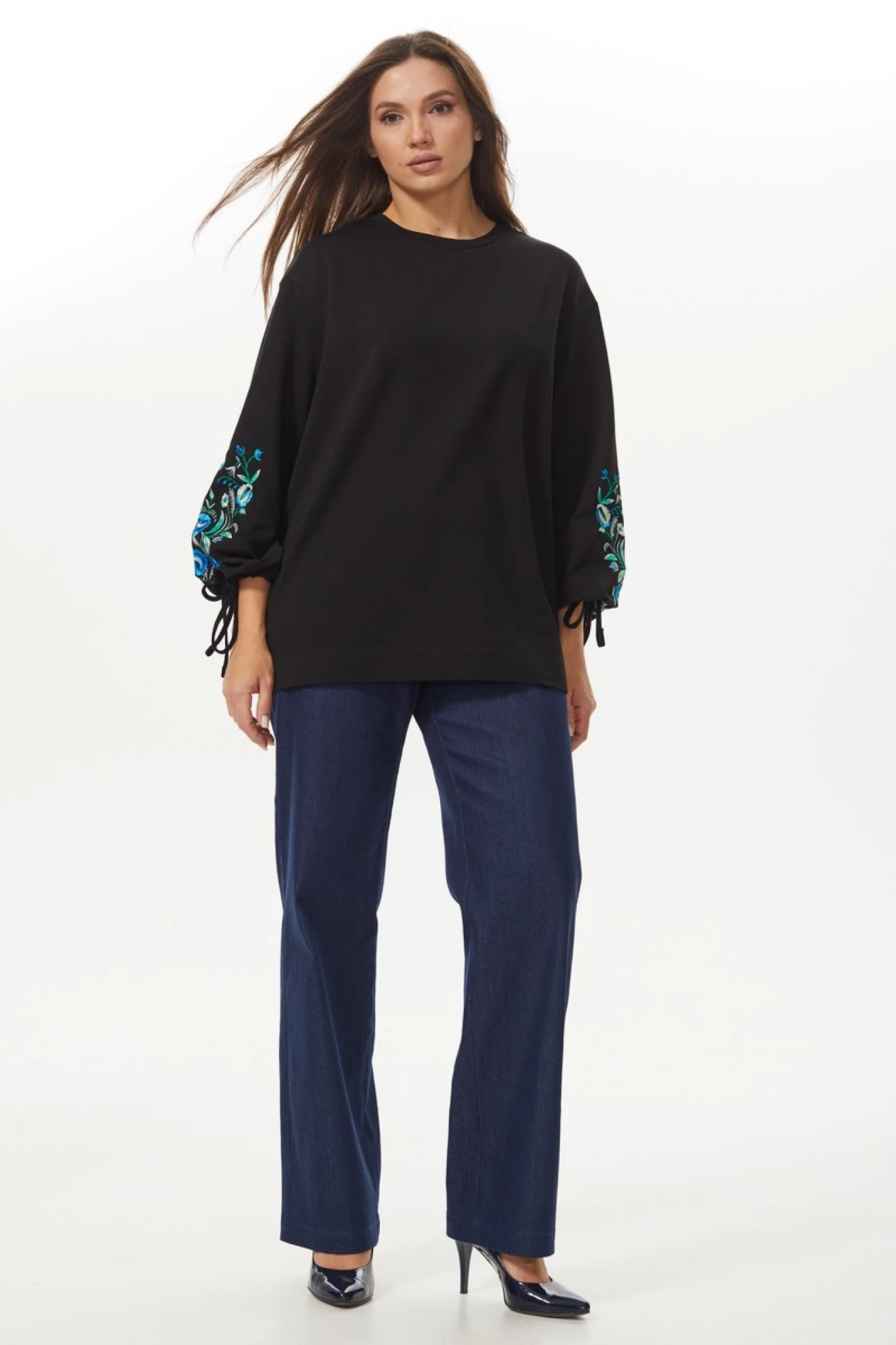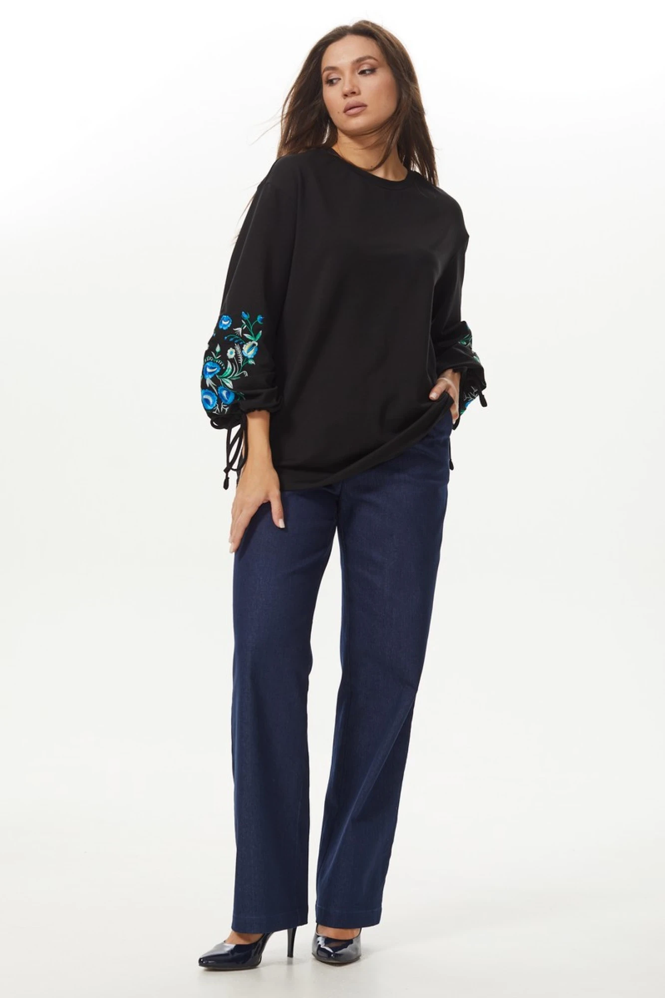 Полочка цельная. Спинка со средним швом. Горловина круглая с бейкой. Рукав одношовный длинный с завязками по низу и с дизайнерской декоративной вышивкой, линия плеча спущена.
