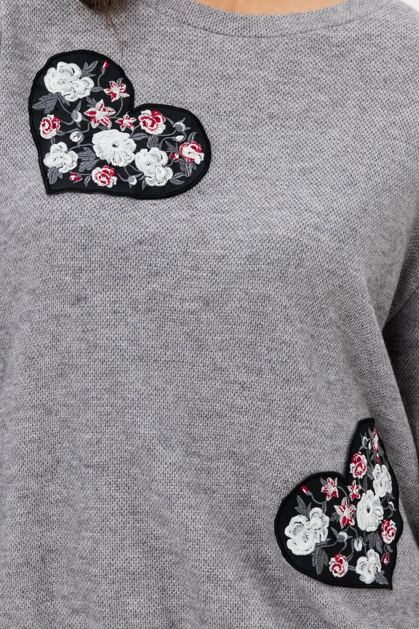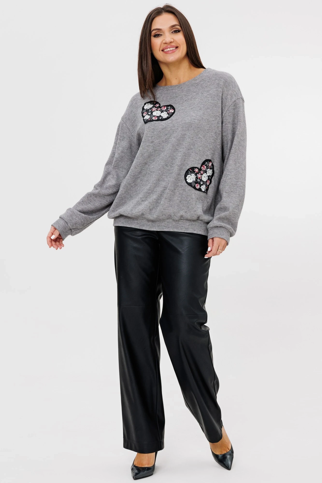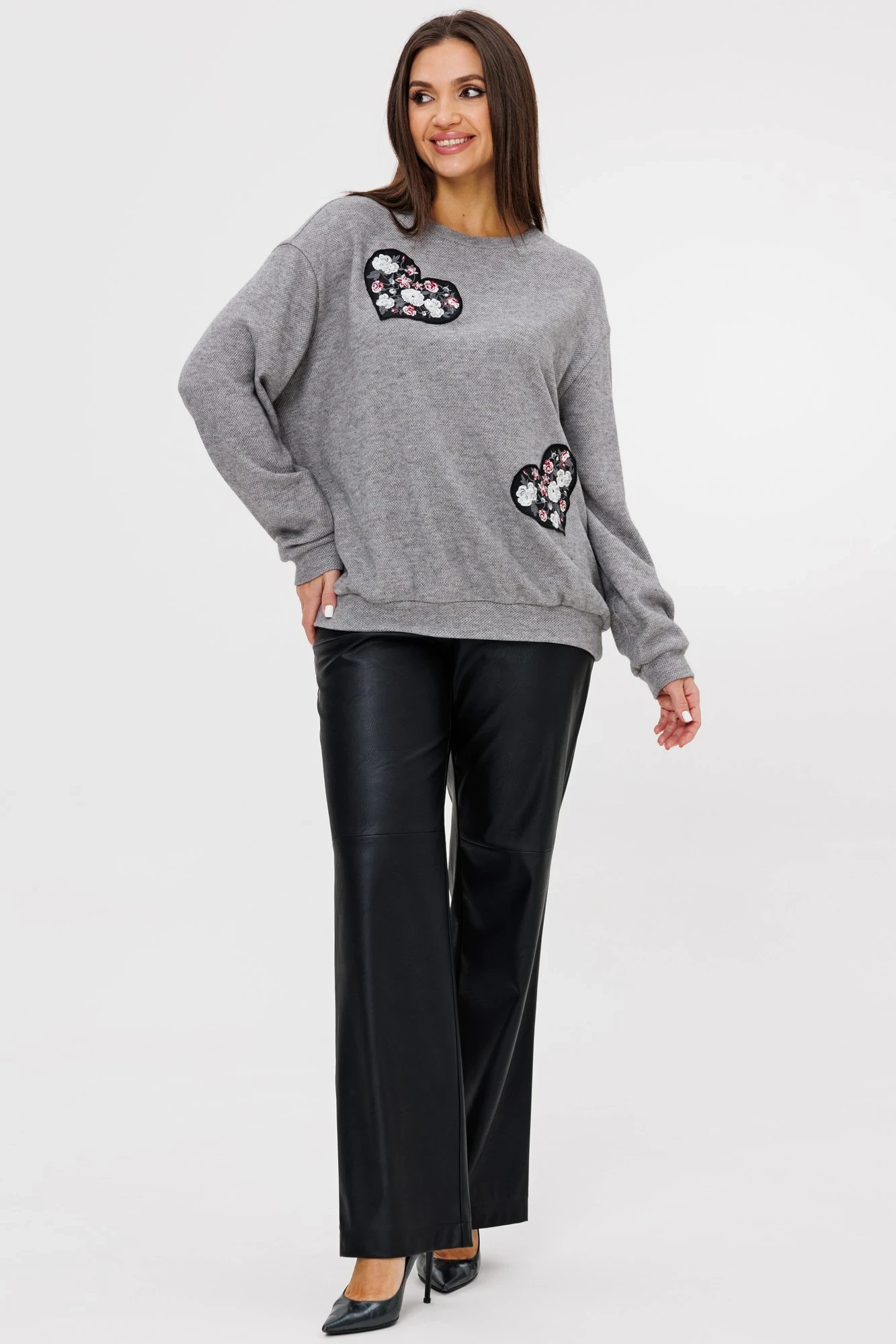 Горловина округлая. Перед цельный с двумя дизайнерскими аппликациями в виде сердца (вышивка на экокоже). Спинка цельная. Рукав длинный со спущенным плечом, одношовный. По низу изделия и рукавов идет притачная манжета.