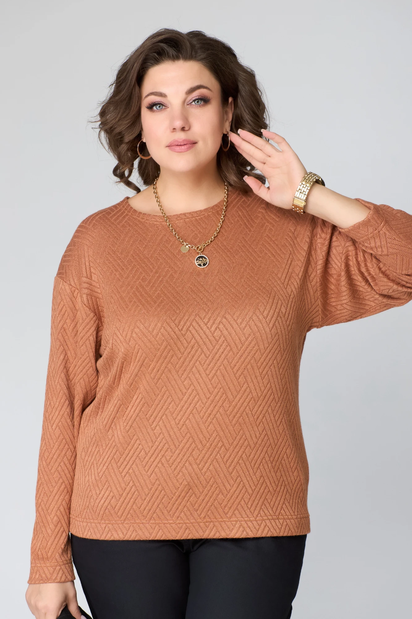 Джемпер имеет округлую горловину, которая создает стильный