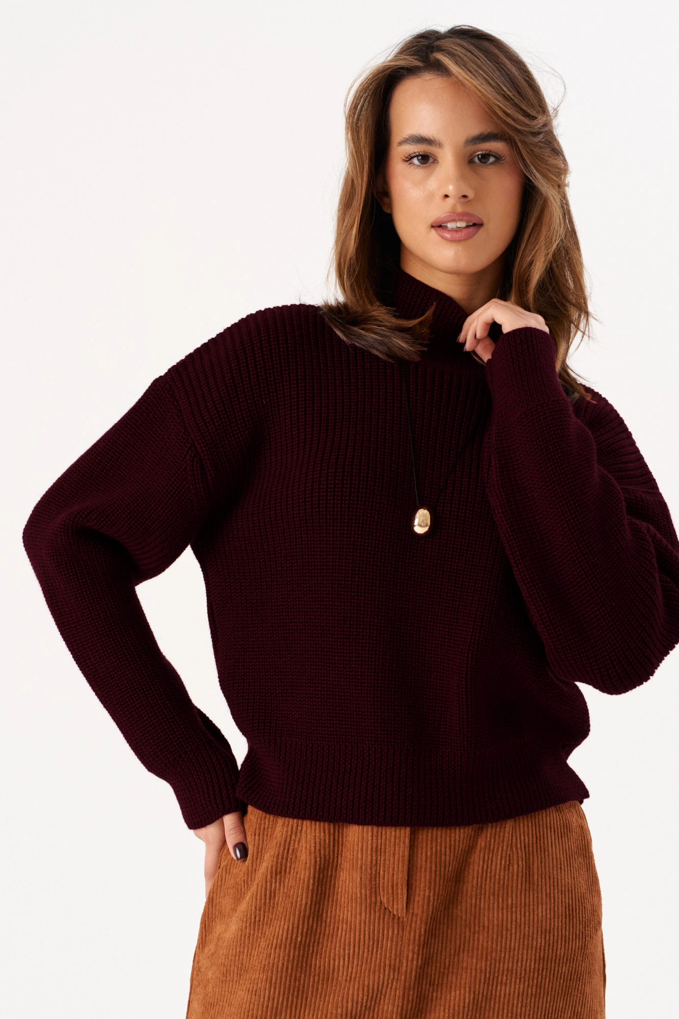 Стильный дизайн: Высокий ворот и простой, но элегантный крой делают этот джемпер универсальным для любого случая.