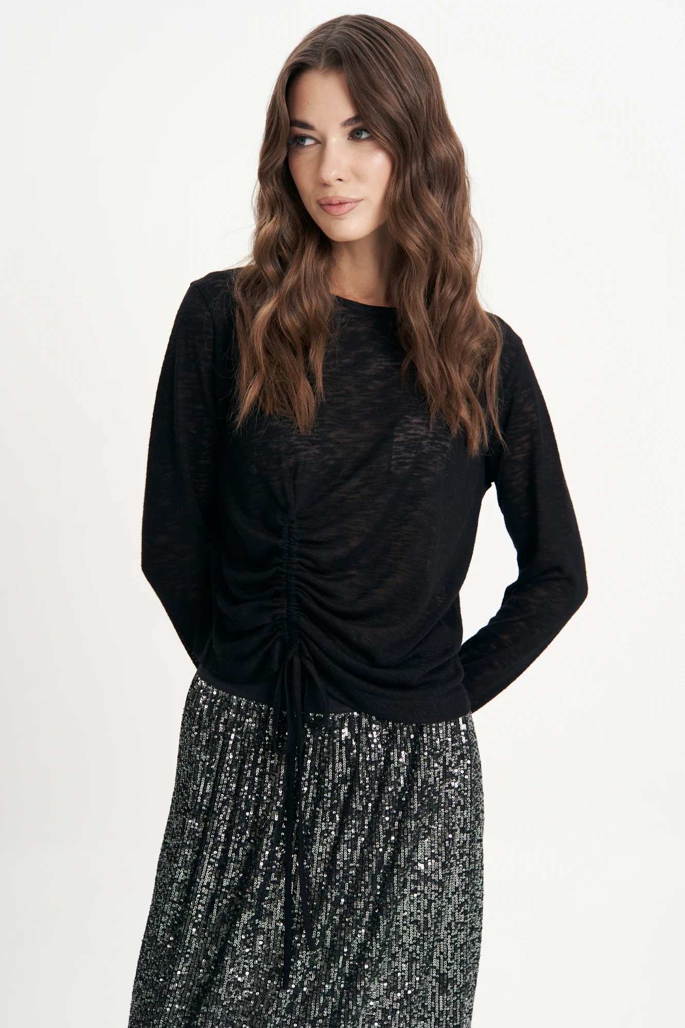 Полуприлегающий силуэт, втачной покрой, круглая горловина, длинный зауженный рукав. По низу джемпера с одной стороны декоративная сборка.
