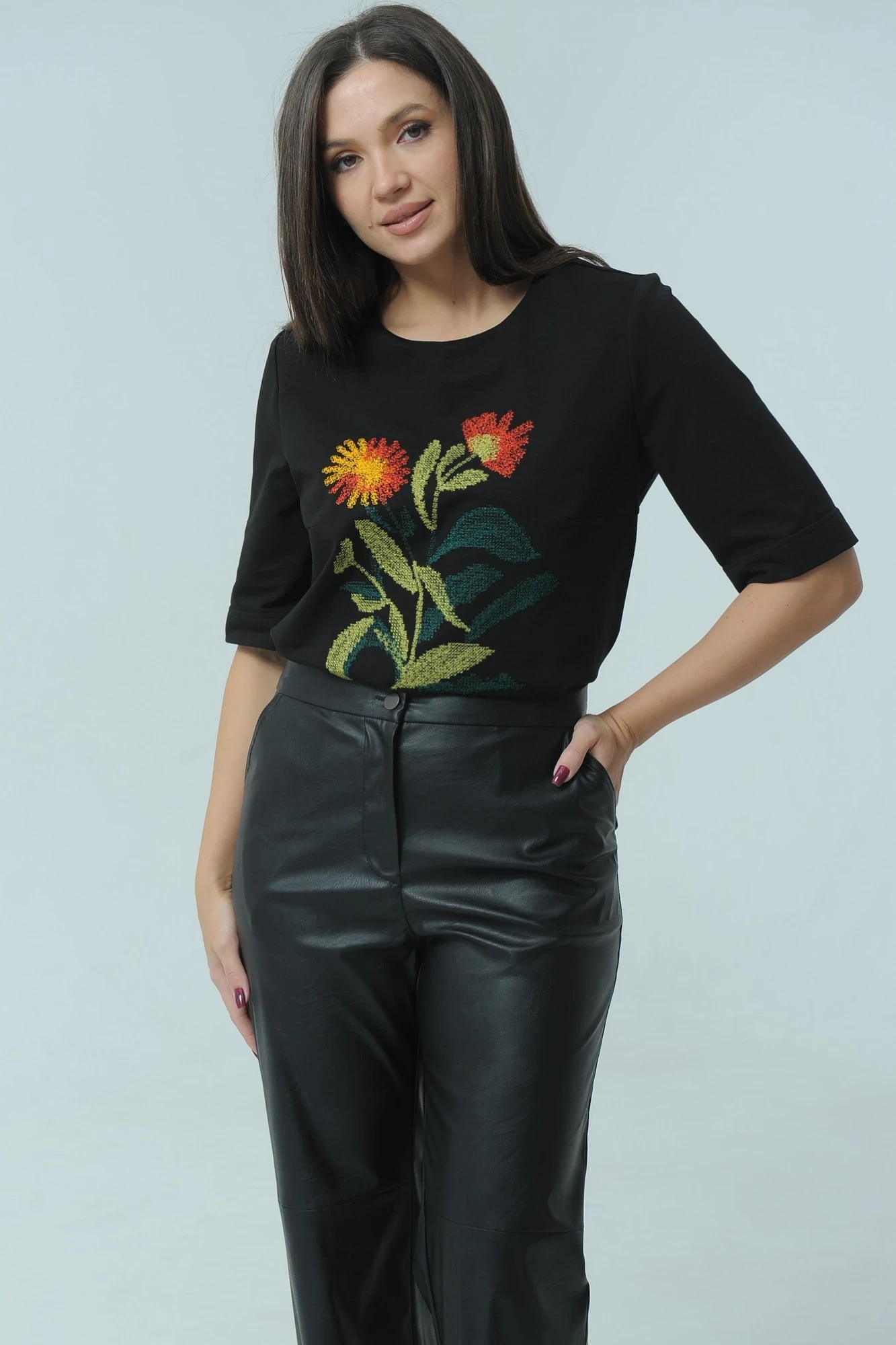 Горловина округлая, обработана обтачкой. Полочка цельная с нагрудными вытачками, на груди дизайнерская вышивка. Спинка со средним швом, в верхней части которого застежка на навесную петлю и пуговицу. Рукав короткий одношовный втачной.