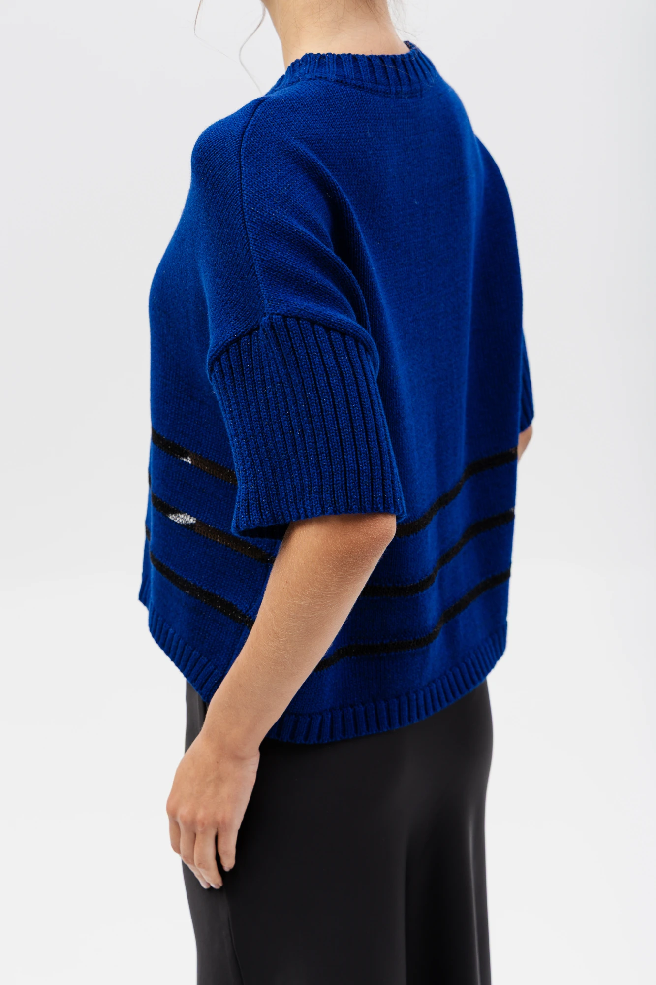 Дизайн: укороченный крой с короткими рукавами и оригинальными ажурными вставками на уровне талии, добавляющими изюминку и лёгкость образу;