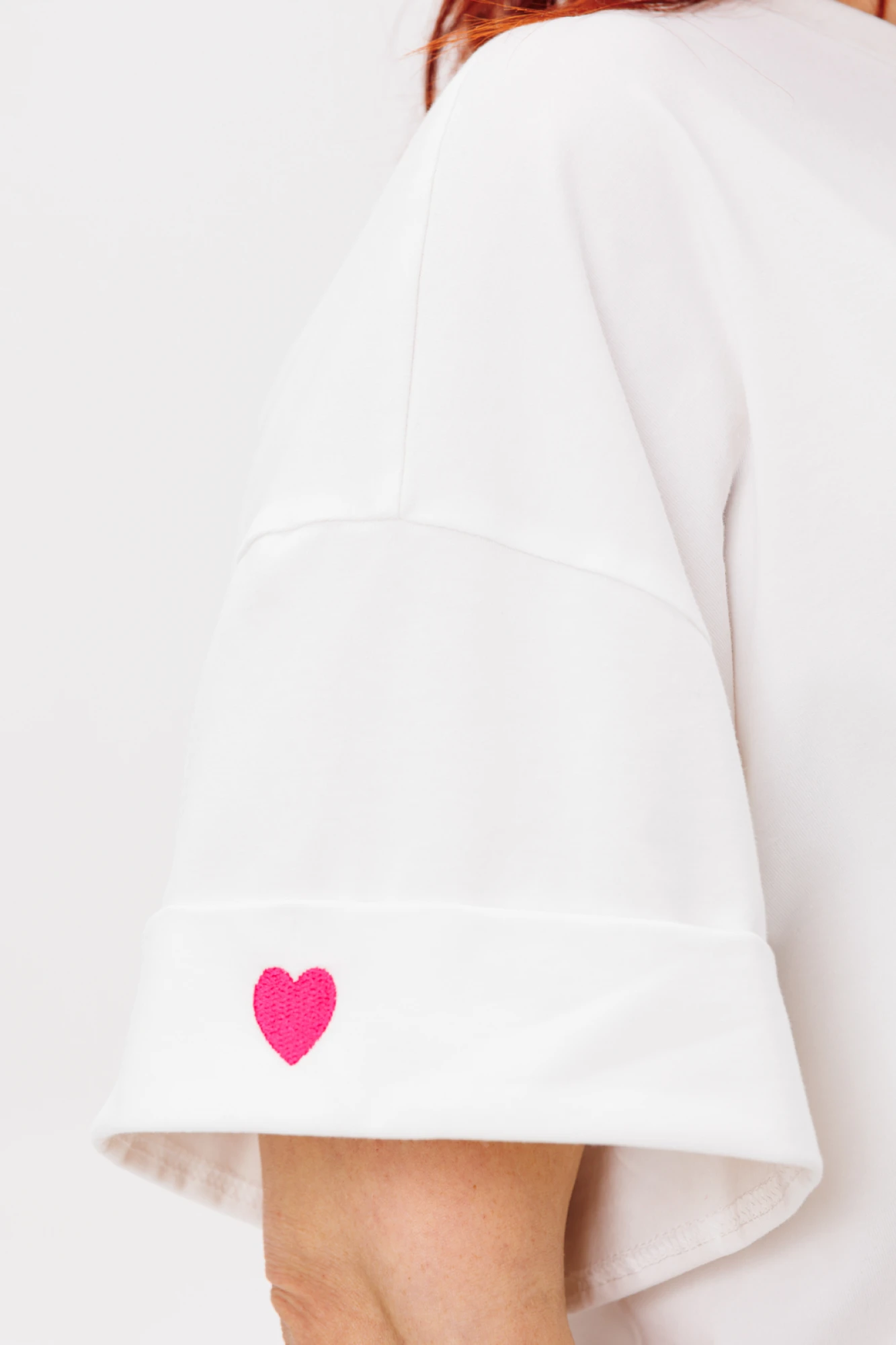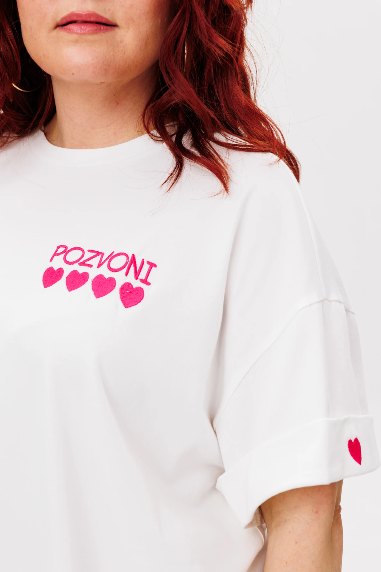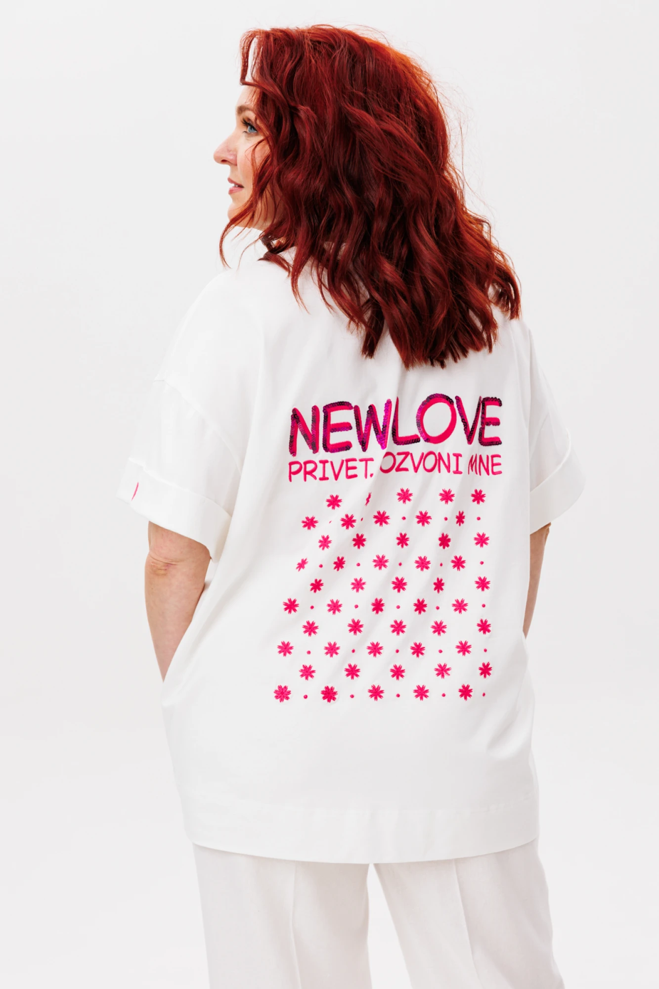 Футболка женская свободного кроя, длиной ниже линии бедер. Линия плеча спущена, рукава короткие, втачные. По горловине притачная планка из отделочной ткани. По спинке, переду и рукавам выполнена авторская вышивка.