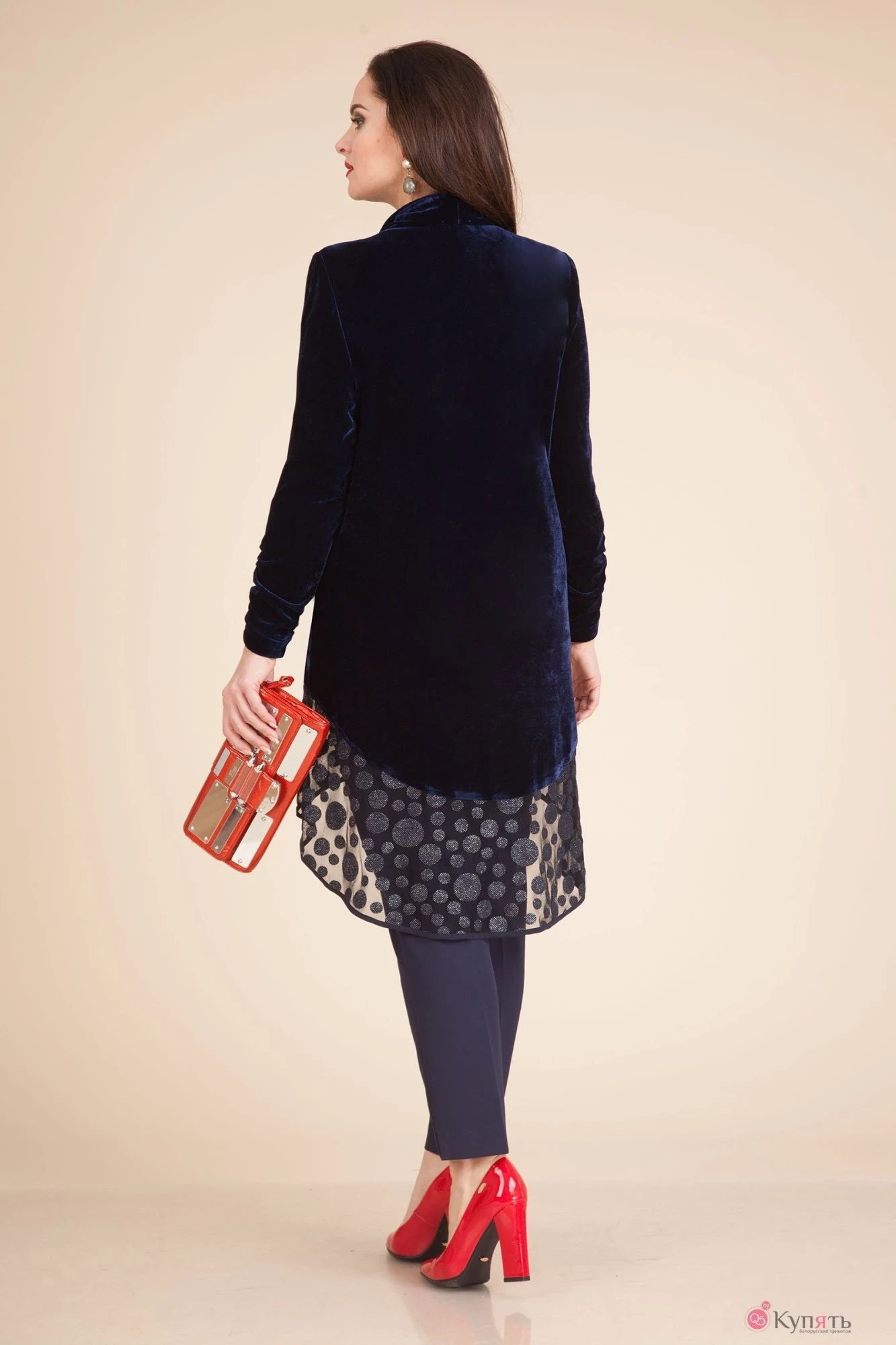 Стильный вечерний комплект, состоящий из удлиненного кардигана и топа. Топ прилегающего силуэта, без рукава; со спущенной линией плеча. Горловина и проймы окантованы; лиф с декоративной кокеткой из сетки. Кардиган прямого силуэта, выполнен из мягкого бархата со вставками из сетки с мерцающим эффектом. Рукав втачной, длинный, низ присборен на венгерку. Воротник отложная стойка. В дополнение к комплекту идет съемная брошь.