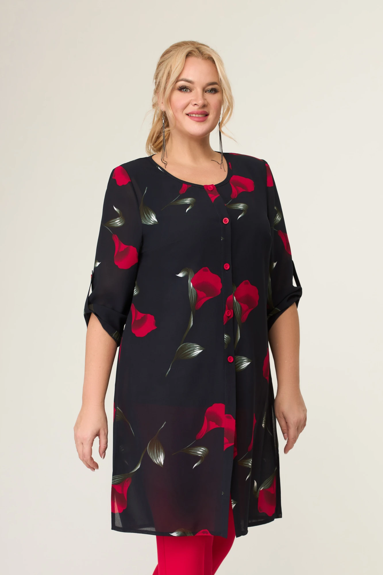 Кардиган выполнен из легкой ткани. Рукав втачной, с декоративной патой по низу. Горловина окантована, по переду застежка на пуговицы. Спинка с кокеткой и складкой. В боковых швах обработаны разрезы.