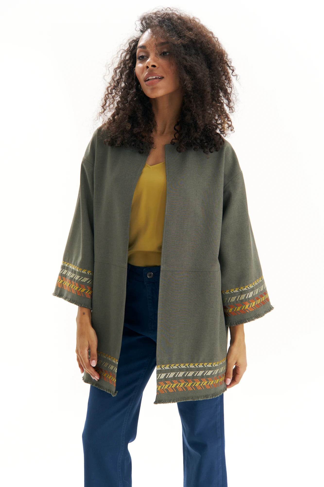 Рукава втачные одношовные со спущенной линией проймы, длиной 3/4. Низ изделия и низ рукавов с бахромой и вышивкой. По проймам, среднему шву спинки, подрезам переда, горловине и краям борта расположена отделочная строчка шириной 0,5.