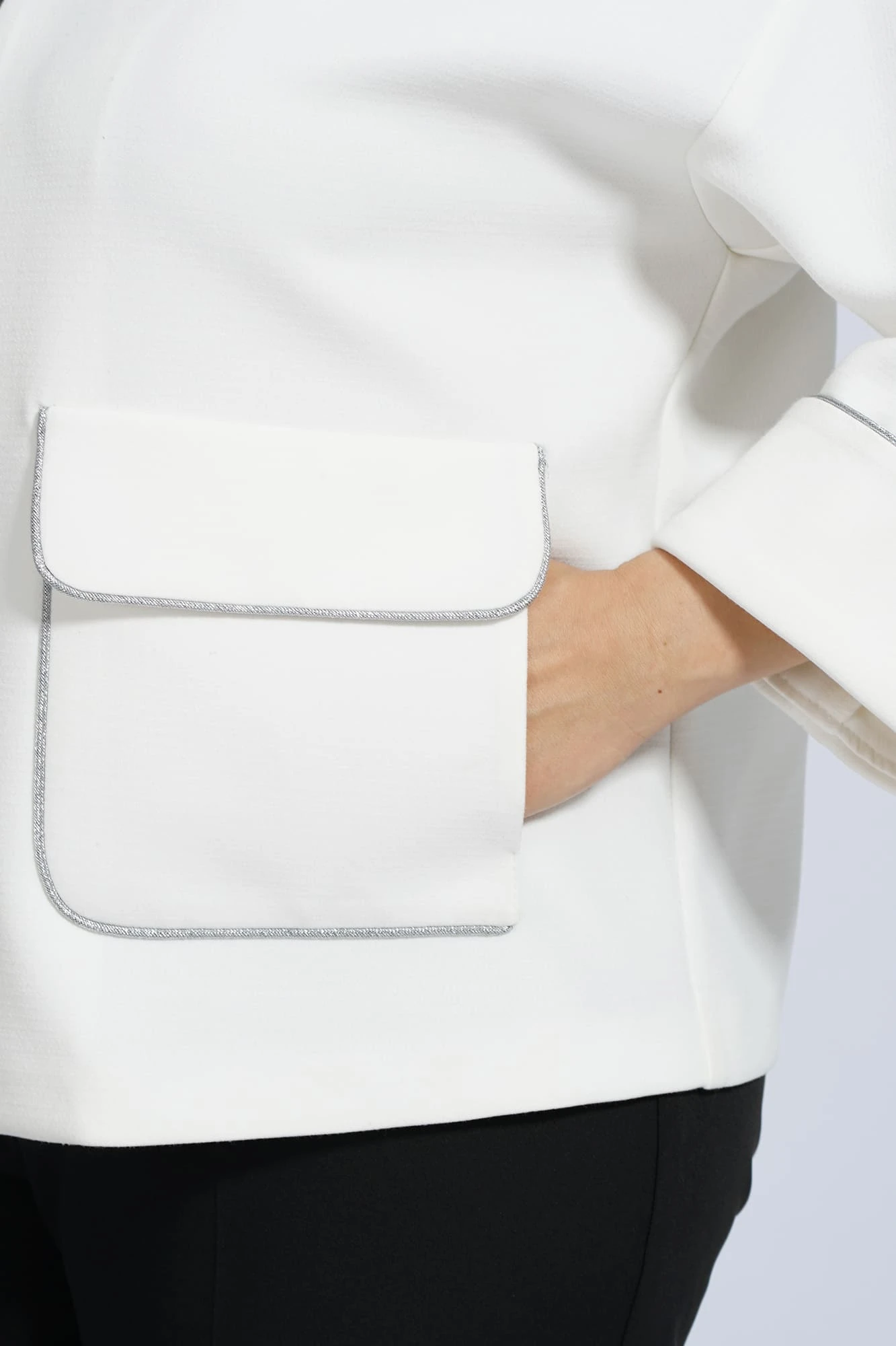50, 52 ,54,56, 58Жакет прямого, свободного силуэта, с отложным воротником, с застёжкой на молнию, со спущенной линией плеча. Перед с накладными карманами (с боковым входом) и клапанами. Рукава втачные, одношовные, длинные, понизу с притачными отложными манжетами. Жакет декорирован по краю клапана, кармана, манжеты отделочным кантом и верху термоопликацией.