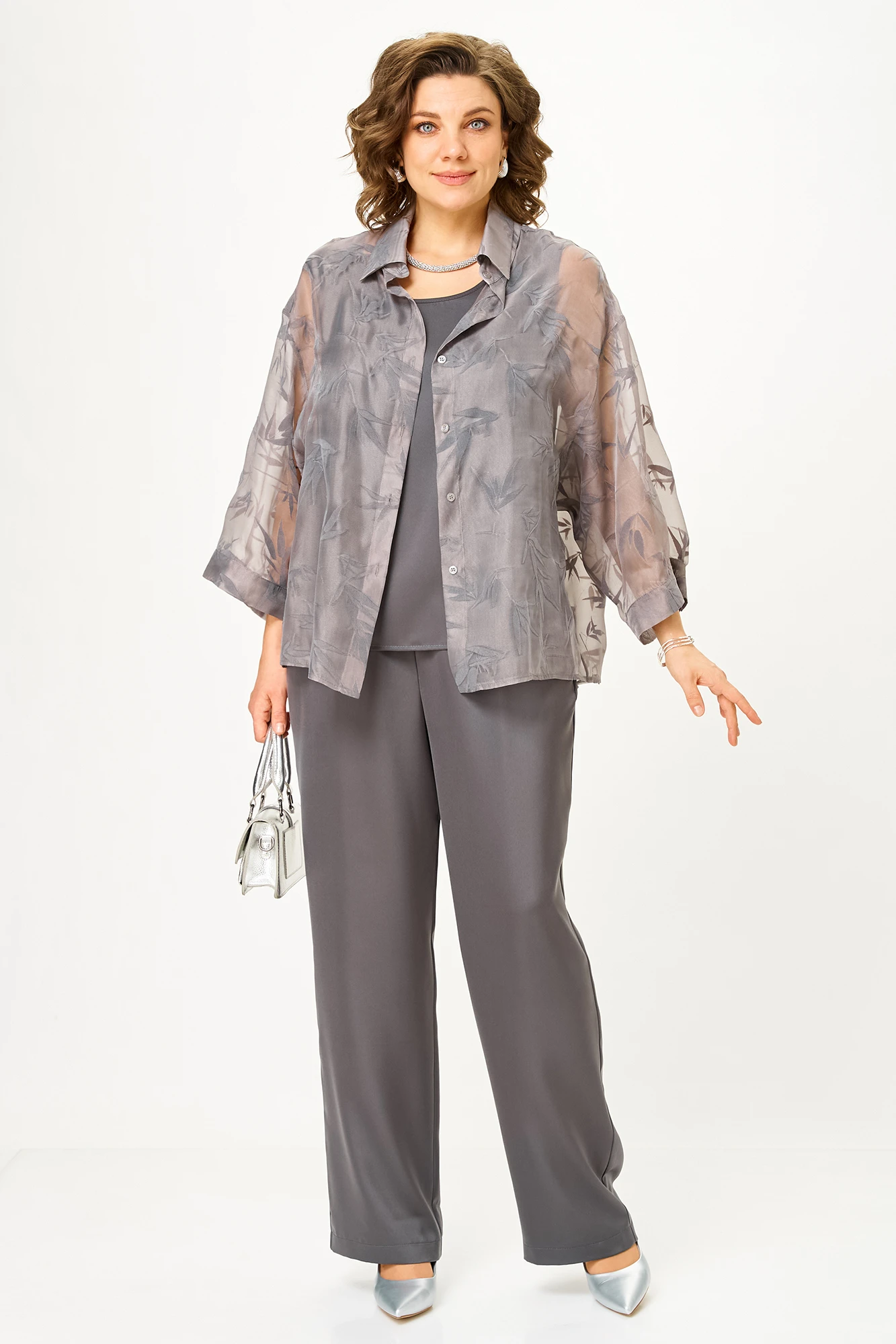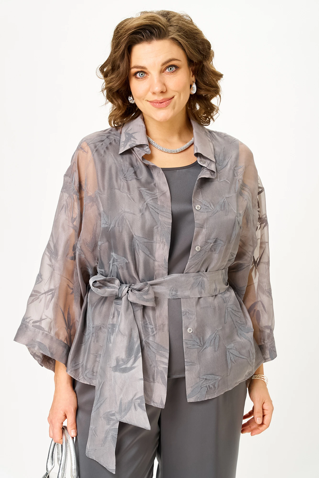 Блузон прямого, свободного силуэта, с удлинённой линией плеча, с завязывающимся поясом, с застёжкой на петли, пуговицы, с разно-уровневым низом (спинка длиннее переда). Спинка с притачной кокеткой и бантовой складкой. Рукава втачные, одношовные, длиной ¾, понизу вдоль разреза планка, мягкие складки и притачные манжеты, застёгивающиеся на петли, пуговицы. Воротник стояче-отложной на отрезной стойке застёгивающейся на петлю, пуговицу.
