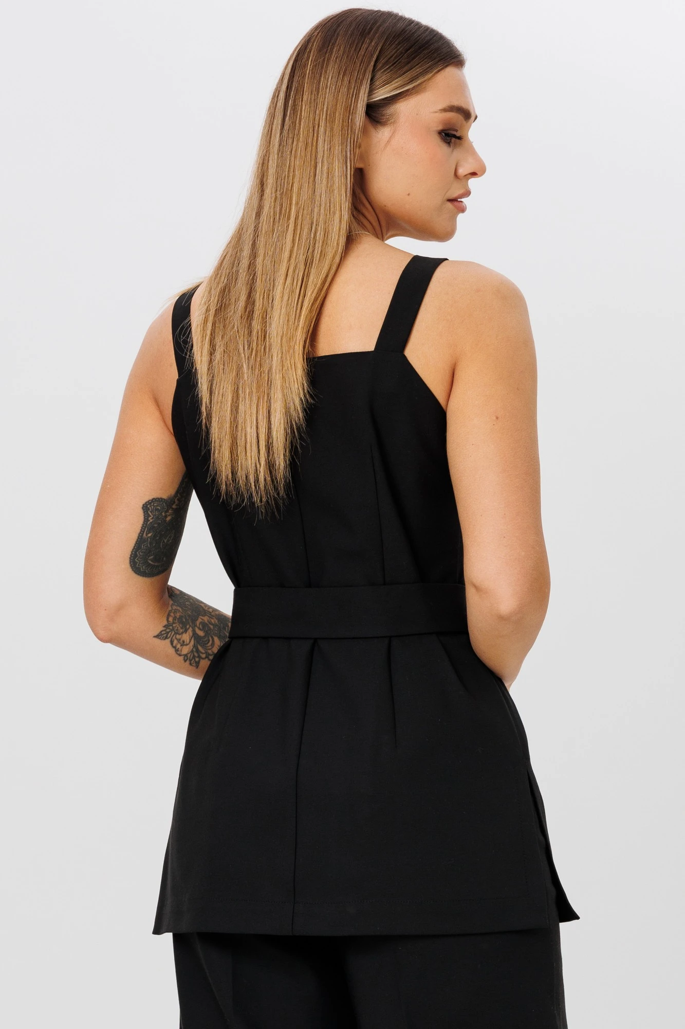 Жилет на бретелях. Перед с центральной застежкой на петли и пуговицы, рельефами и настрочными клапанами. Спинка со средним швом и талиевыми вытачками. В боковых швах разрезы.