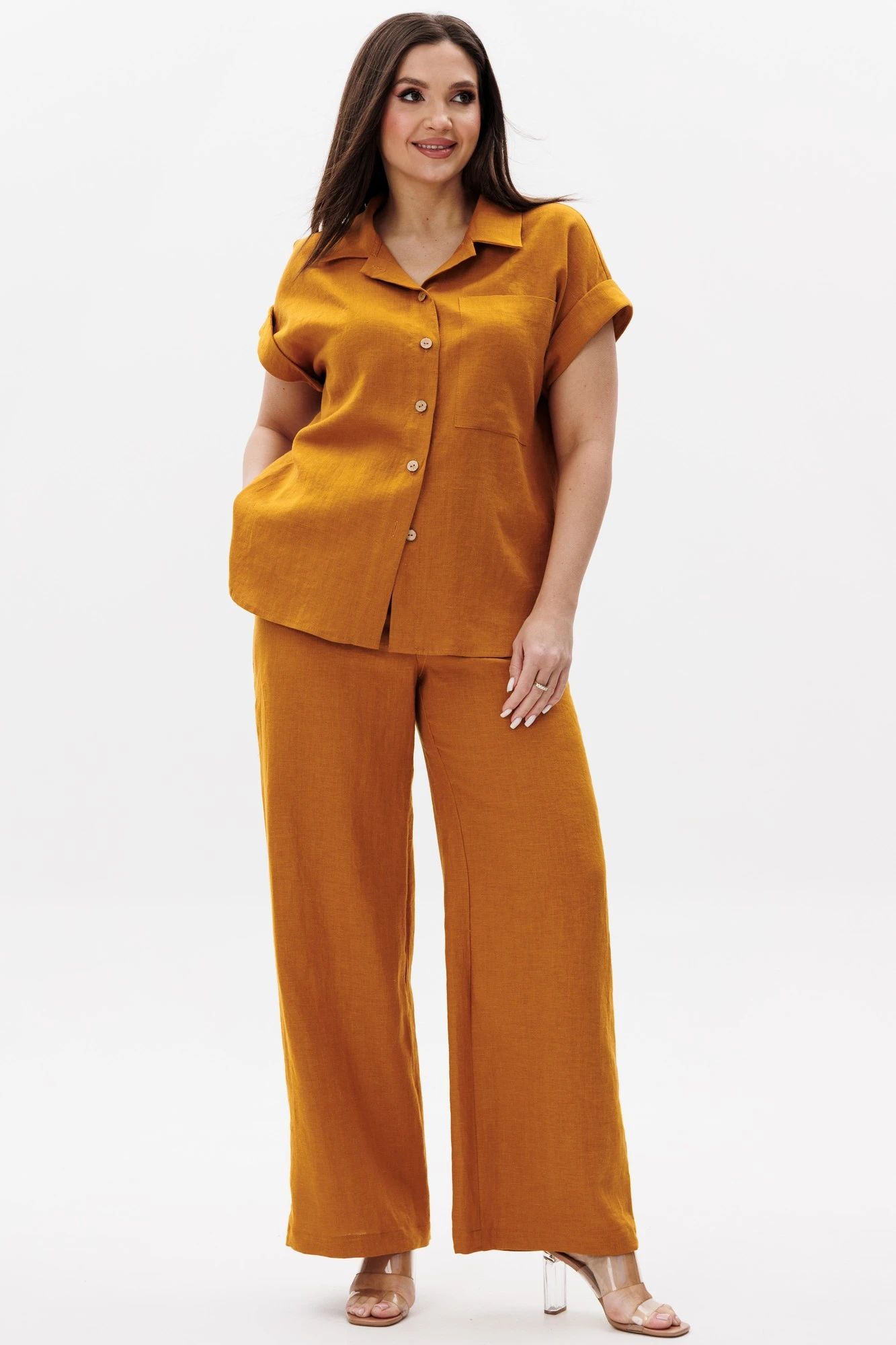 Костюм выполнен из качественного белорусского льняного полотна (пр-во Орша). Ткань не тянется. В больших размерах костюм представлен в нашей линейке MaCherie (модель 3144)