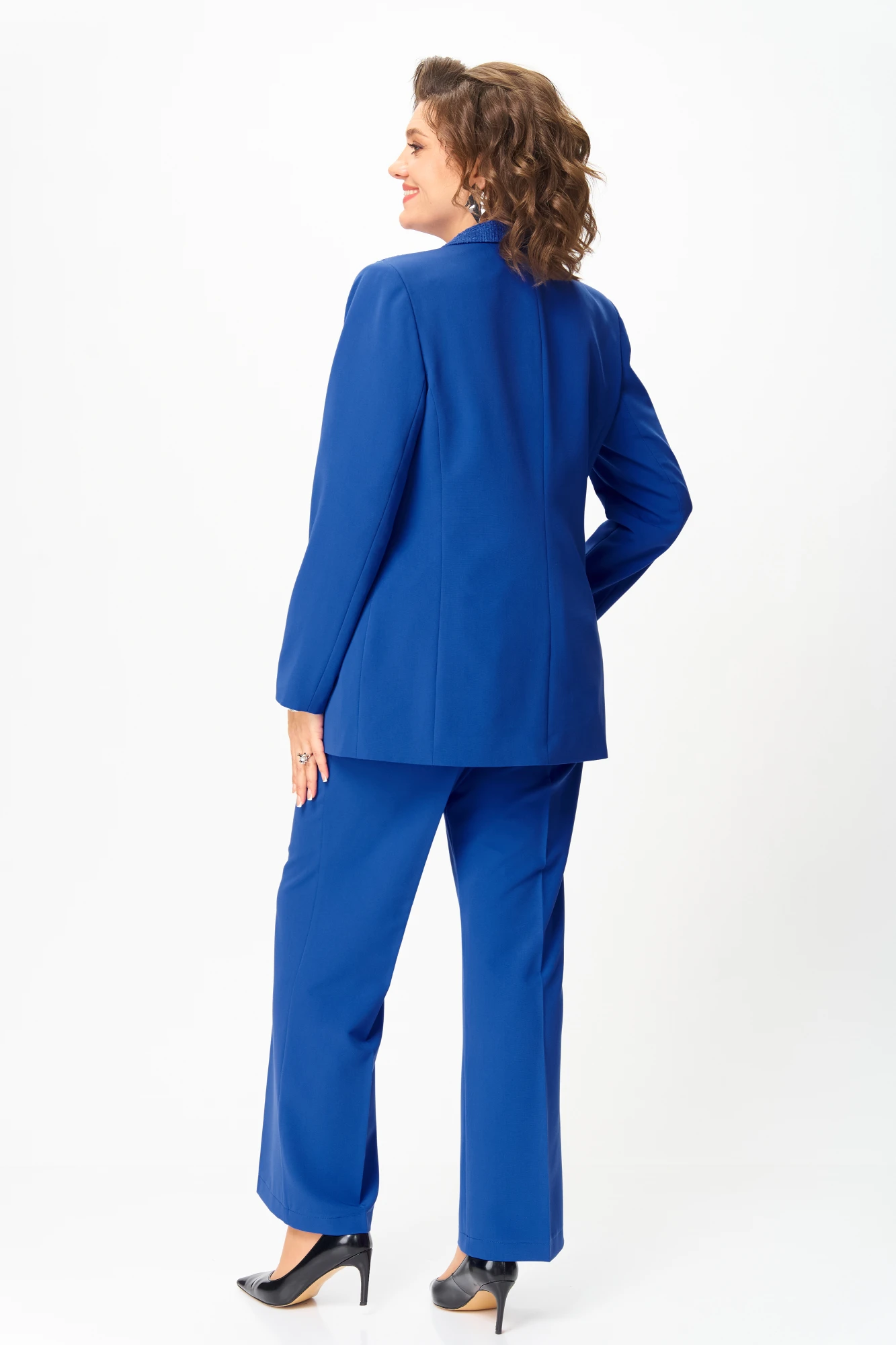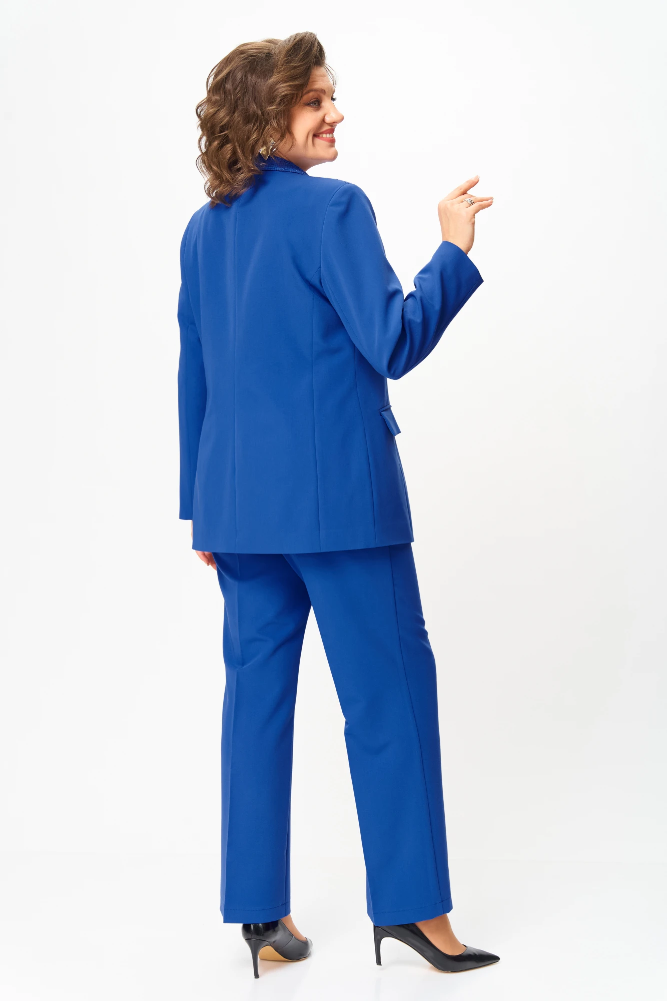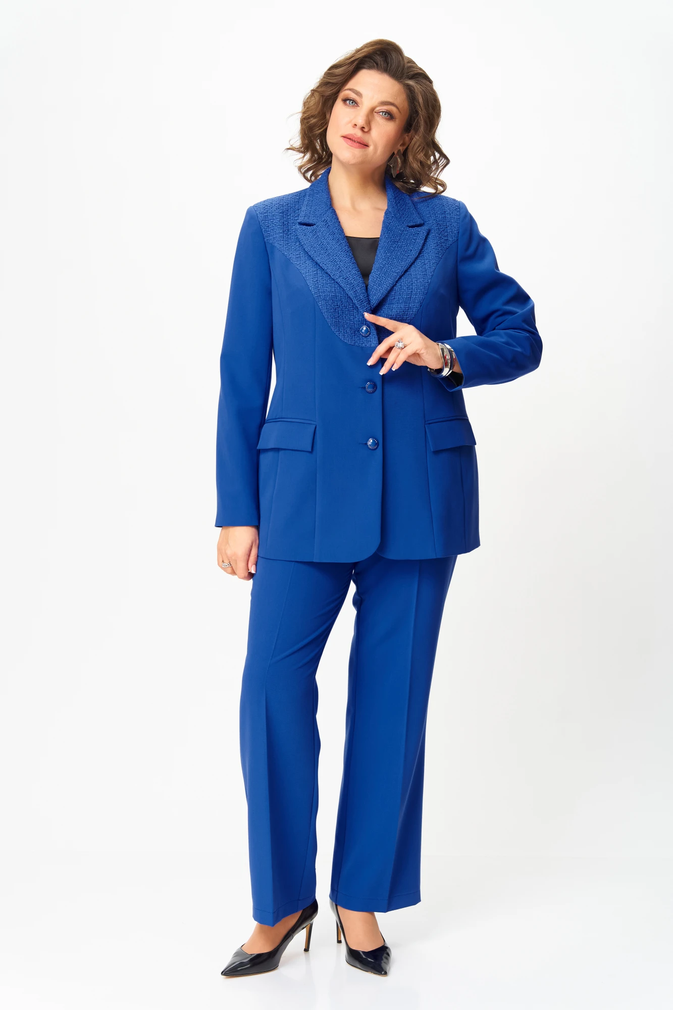 Полочка жакета с однобортной центральной застежкой на петли и пуговицы, вертикальными рельефами и прорезным карманом с клапаном. В верхней части полочки обработана фигурная кокетка из отделочной ткани. Горловина V-образной формы, с отложными лацканами и воротником пиджачного типа. Спинка со средним швом и вертикальными рельефами. Рукав длинный, двухшовный, втачной.