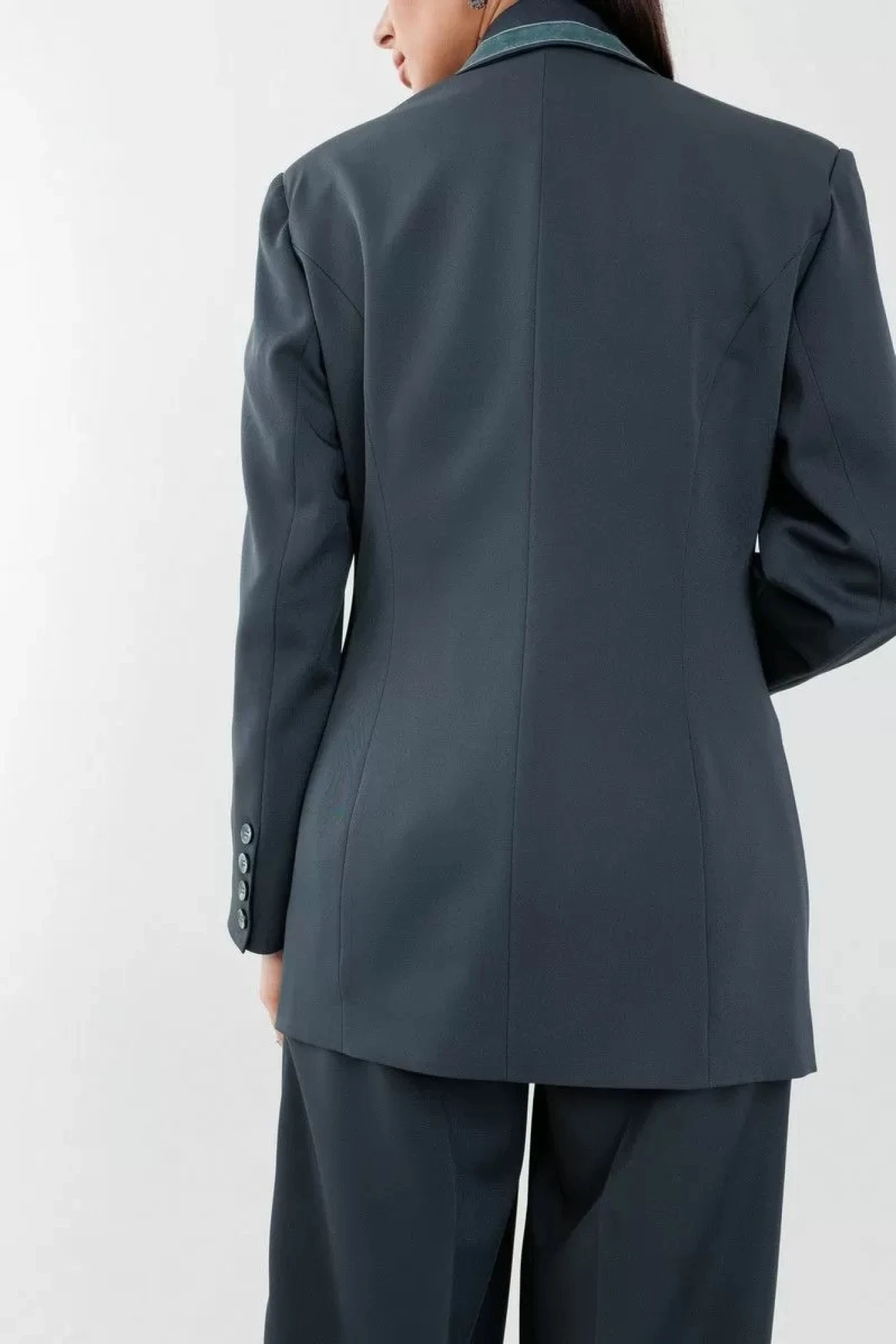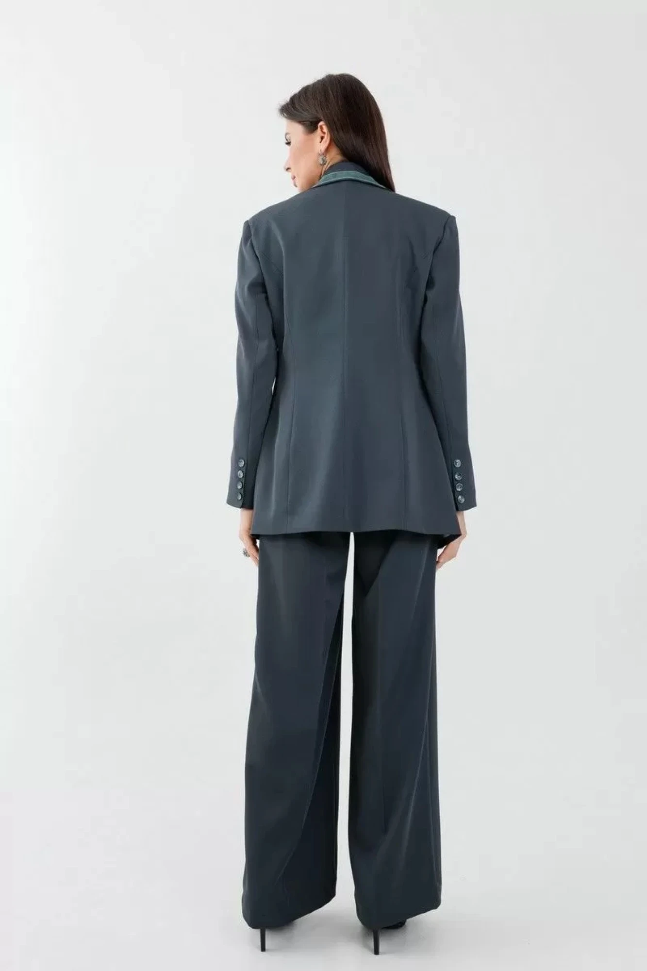 Жакет слегка приталенный, длиной до бедра, застежка на петлю пуговицу. Рукав длинный со шлицей, с декоративными пуговицами. Жакетный отложной воротник декорирован бархатной тесьмой. По переду прорезные карманы с клапаном. Жакет на подкладке. Подчеркнуть талию можно поясом.