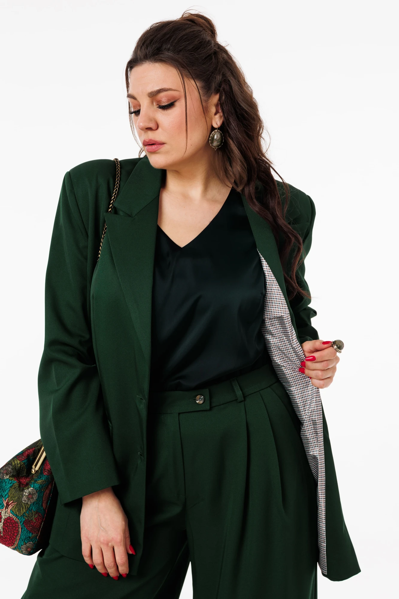 54,56Жакет с архитектурным кроем, принтованной подкладкой и функциональными деталями, такими как карманы с клапаном, добавляет ему изысканности и практичности. Брюки-палаццо с высокой посадкой, мягкими складками и боковыми карманами создают элегантный и комфортный силуэт, который подчеркивает фигуру и подходит для разных сезонов.