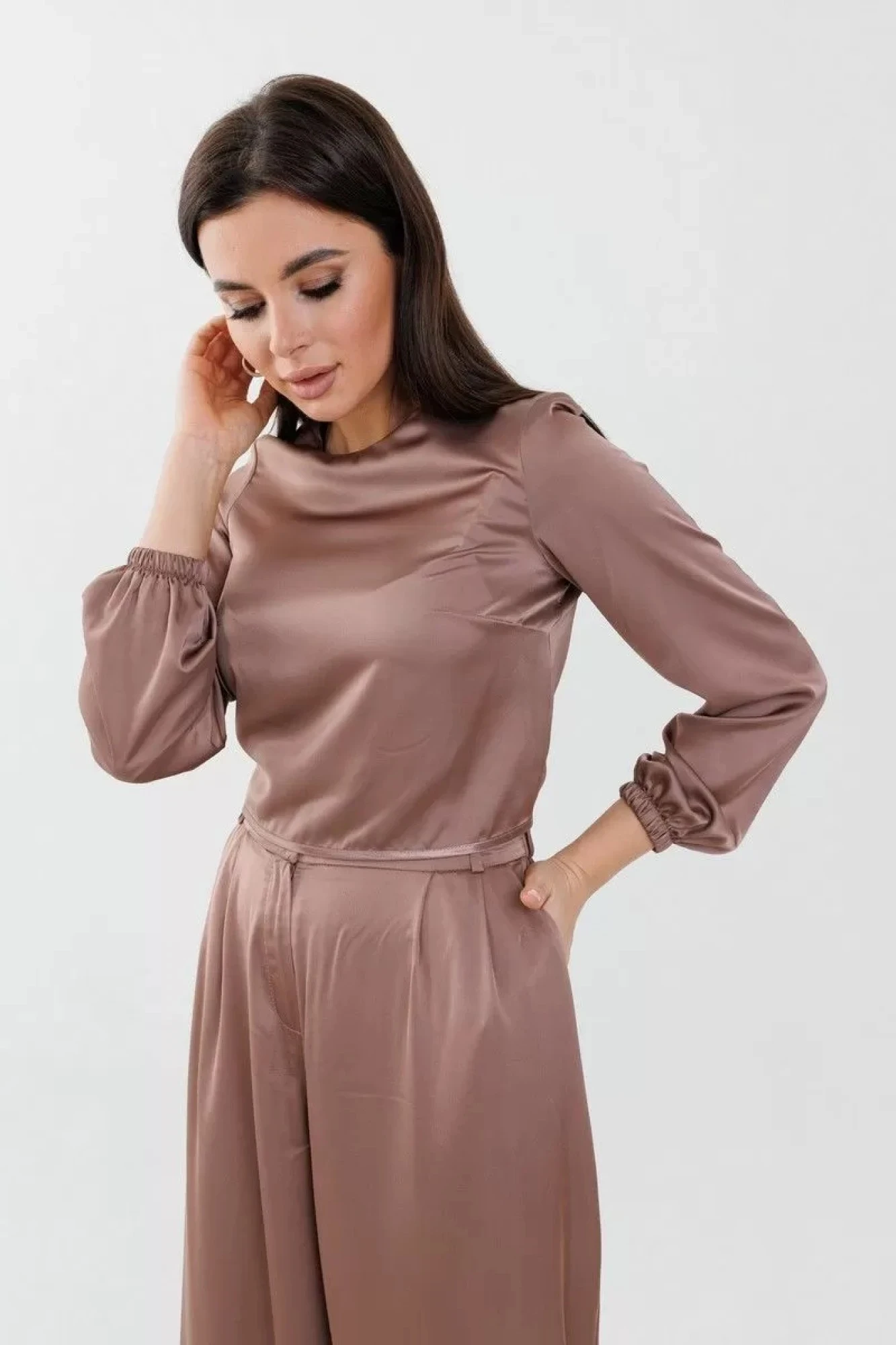 Брюки женские, высокая посадка, длинные, расширенные к низу. По переду защипы моделирующие фигуру и боковые карманы. По спинке талиевые вытачки. Притачной пояс на петли пуговицы, по переду застежка молния, по спинке вшита эластичная лента, есть шлевки.
