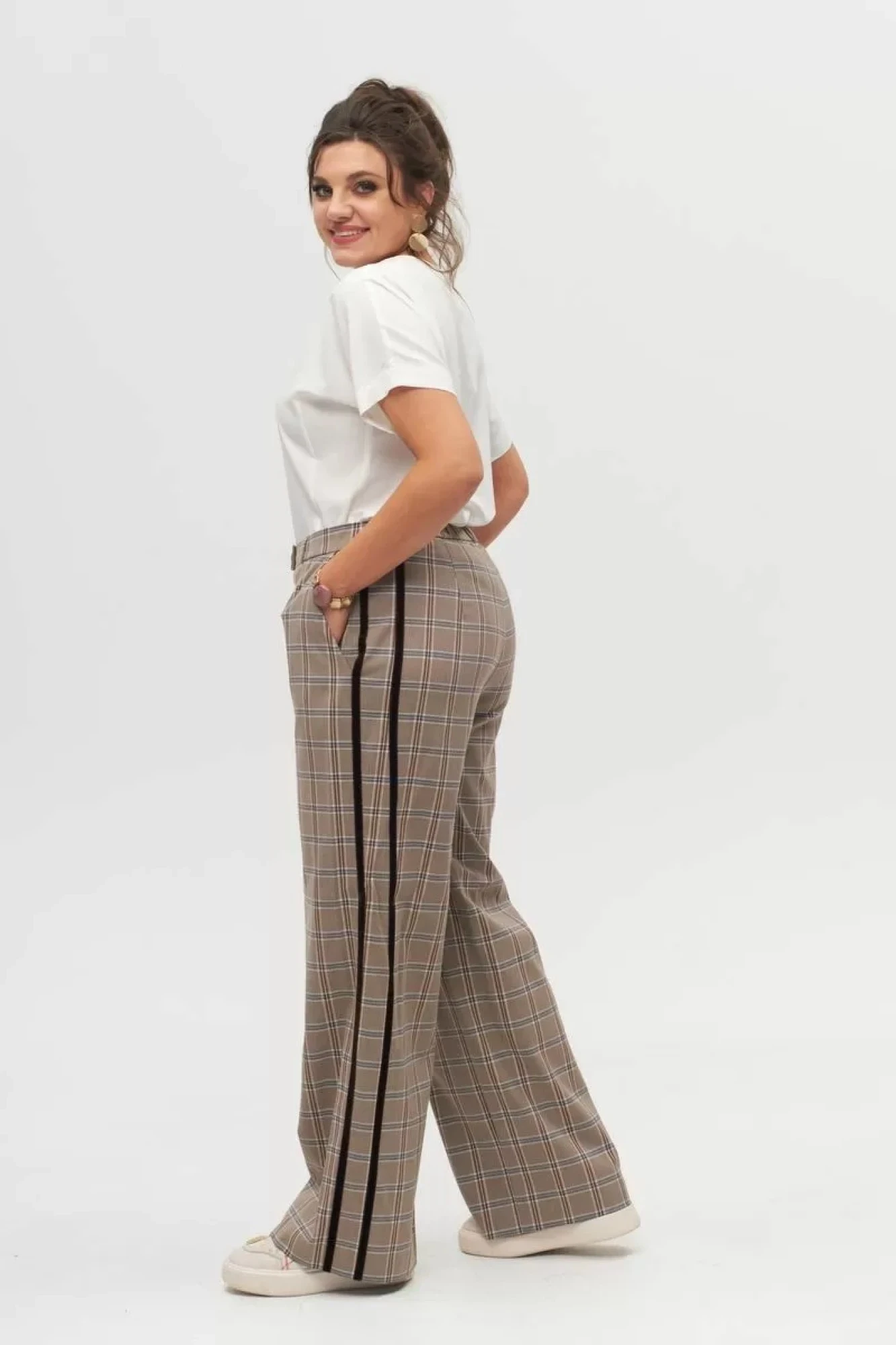 46, 48 ,50,52,54,56,58Брюки женские прямого силуэта, высокая посадка. По переду боковые карманы и застежка молния. Параллельно боковому шву идут лампасы. Прилегание по спинке достигнуто при помощи талиевых вытачек. Притачной пояс на петлю пуговицу, от бокового шва по спинке на резинке.