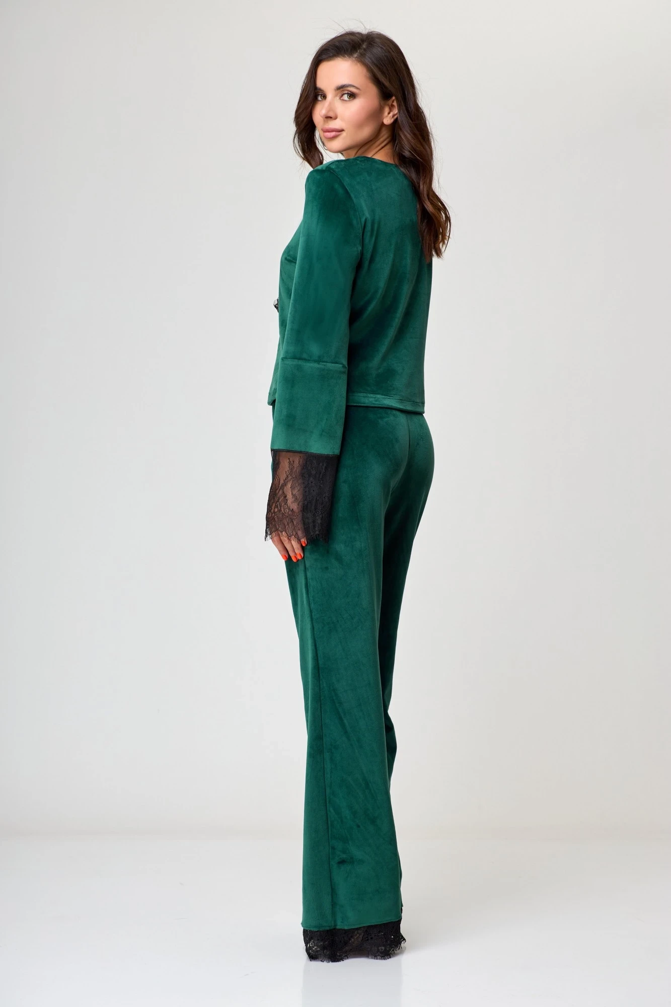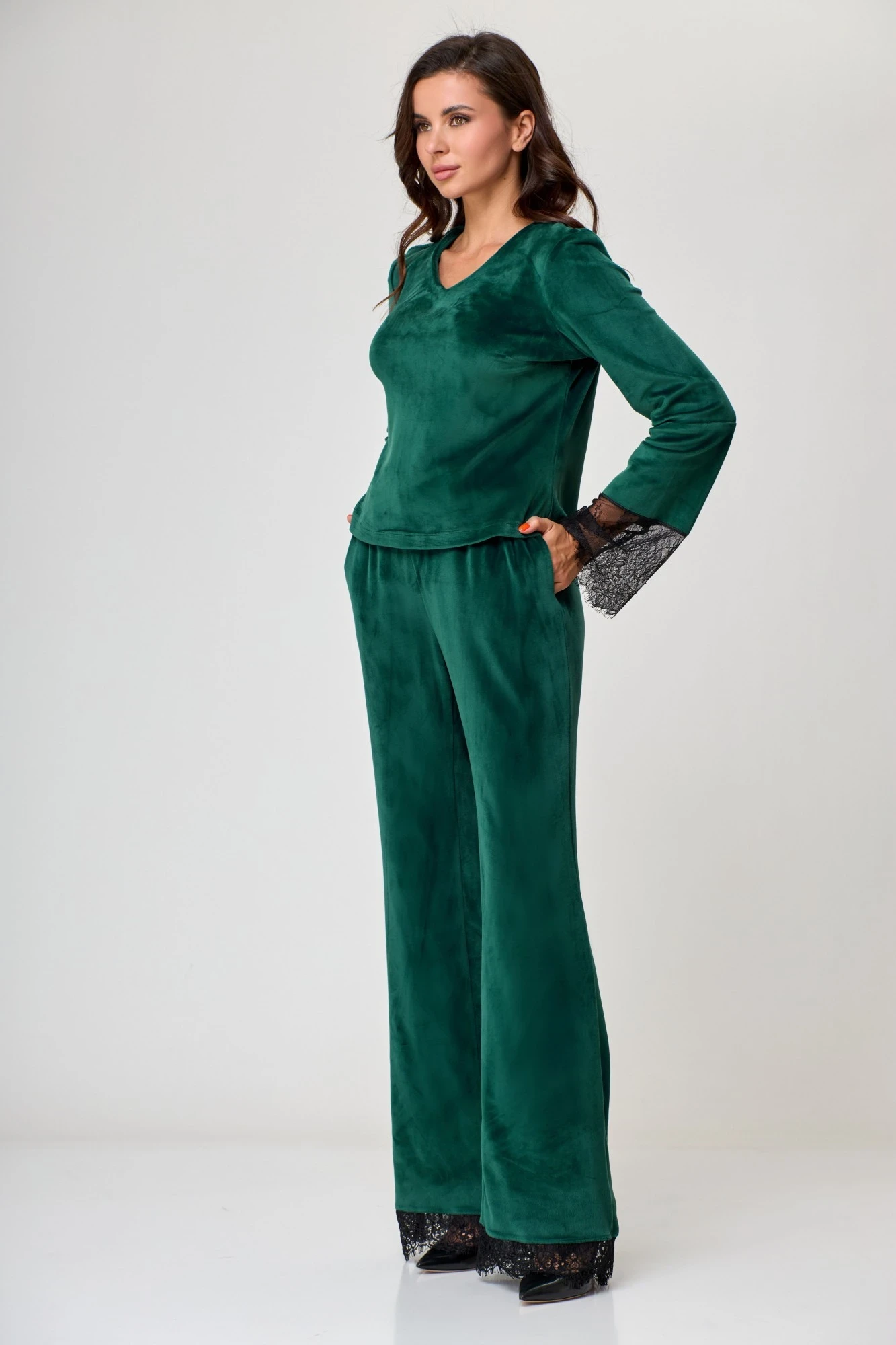 Джемпер женский, до бедра. Рукав втачной, расширенный к низу, низ декорирован кружевом. По переду нагрудные вытачки, горловина V-образная, обработана обтачкой.