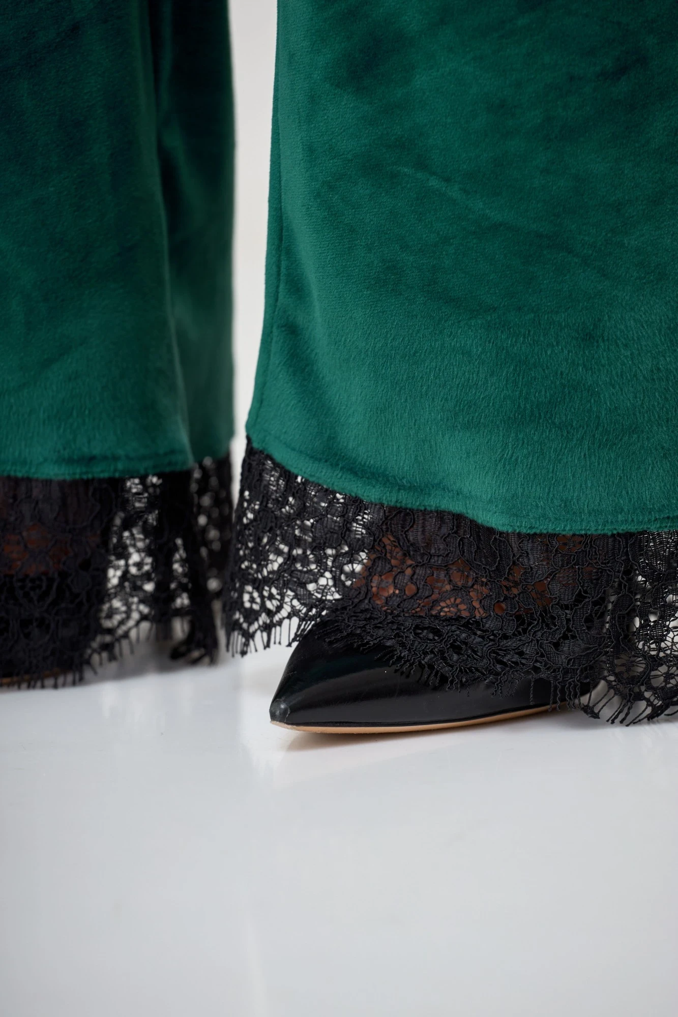 Брюки женские, на резинке, карманы в боковых швах. К низу брюки расширены и декорированы кружевом.