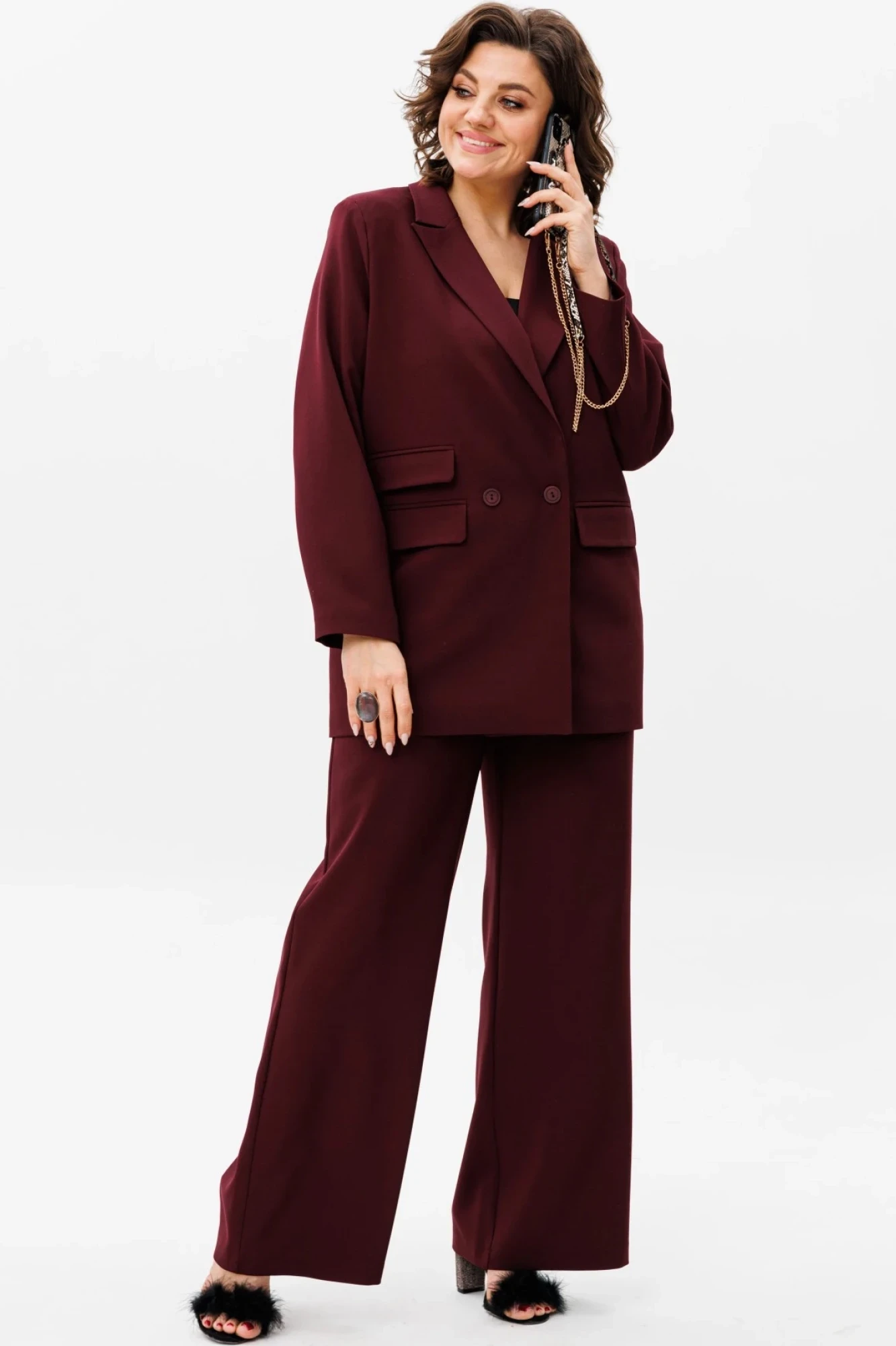 50,52,54, 56Прямой двухбортный жакет, брюки на резинке по спинке и с карманами.