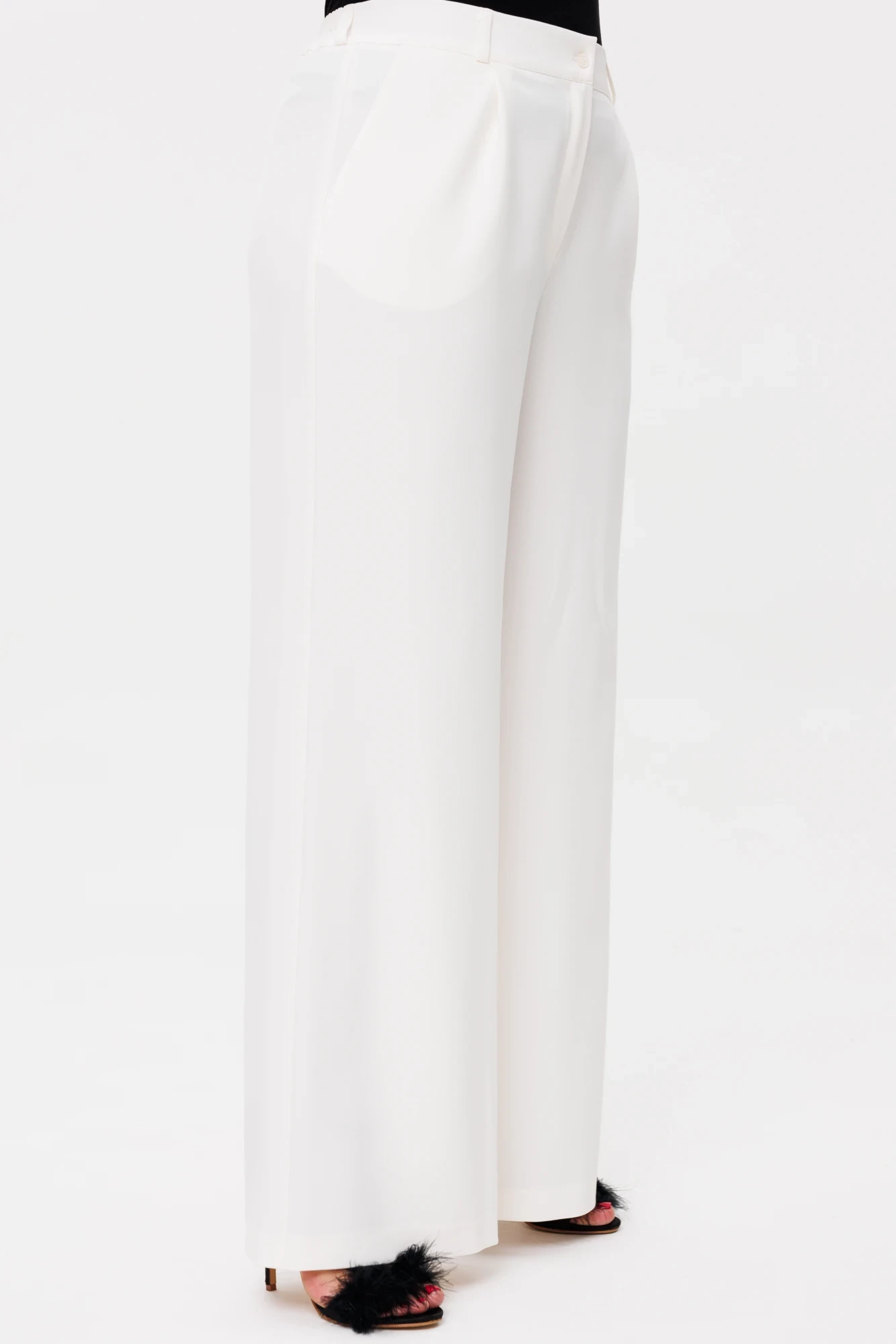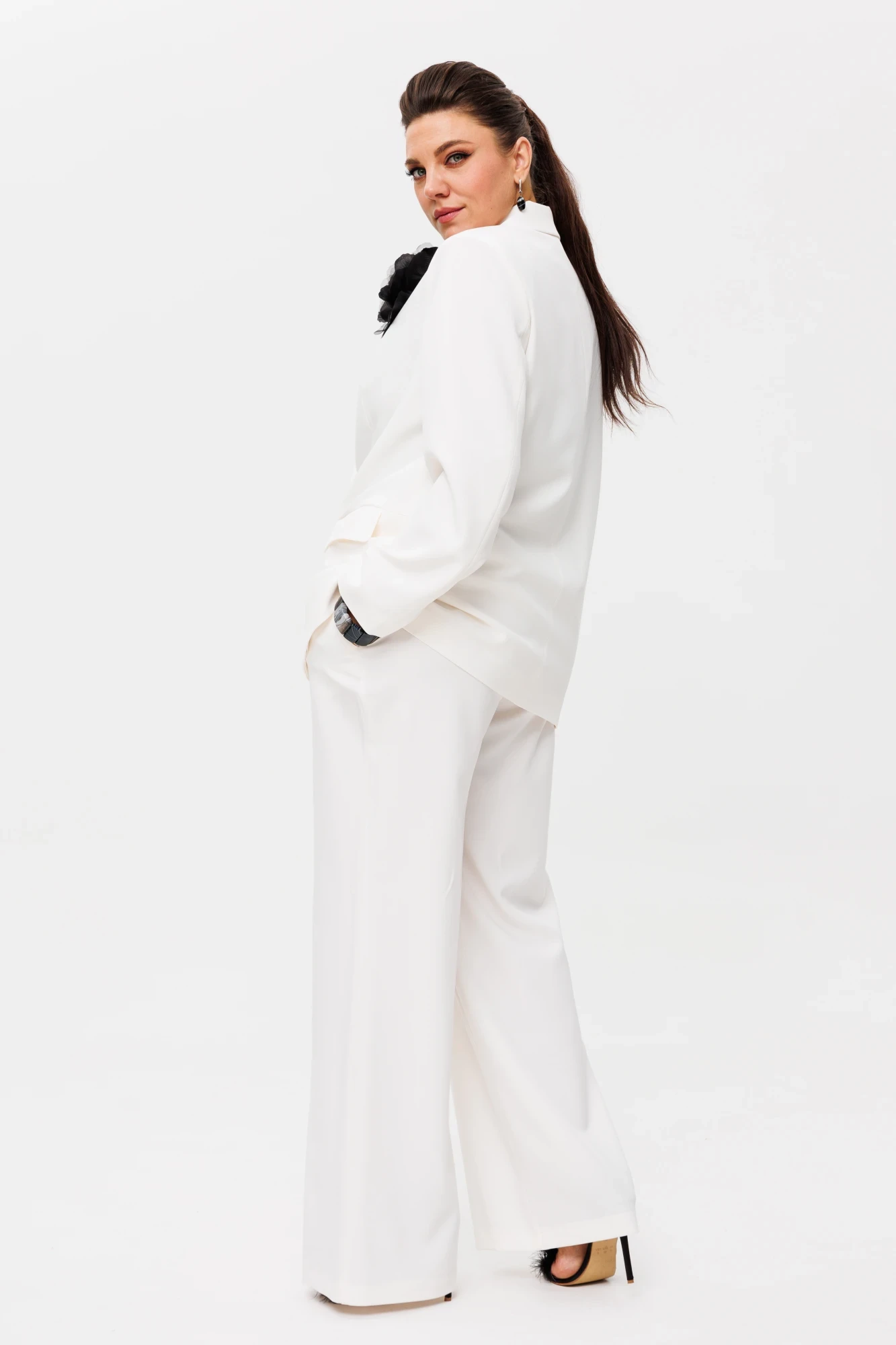 Брюки палаццо на резинке с карманами создают эффектный силуэт и придают образу легкость и грацию. Однобортный оверсайз жакет добавляет современную нотку и непринужденность, делая костюм идеальным выбором для любых случаев — от деловых встреч до вечерних прогулок.
